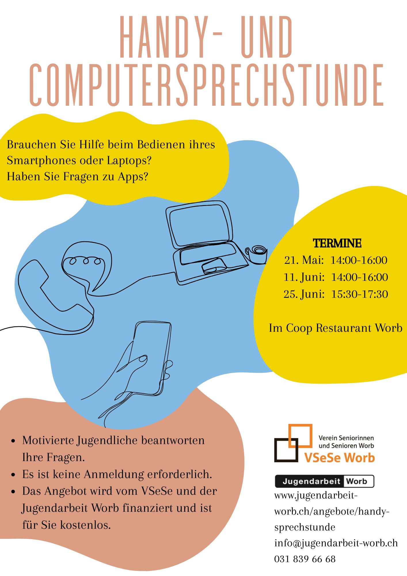 In einem unkomplizierten "Walk-in"-Setting bieten Jugendliche Unterstützung bei einfachen Fragen zu Handys und Laptops an. Die Sprechstunden finden an drei Terminen im Mai und Juni statt und richten sich an alle Menschen aus der Gemeinde Worb, die Hilfe im Umgang mit digitalen Geräten benötigen.