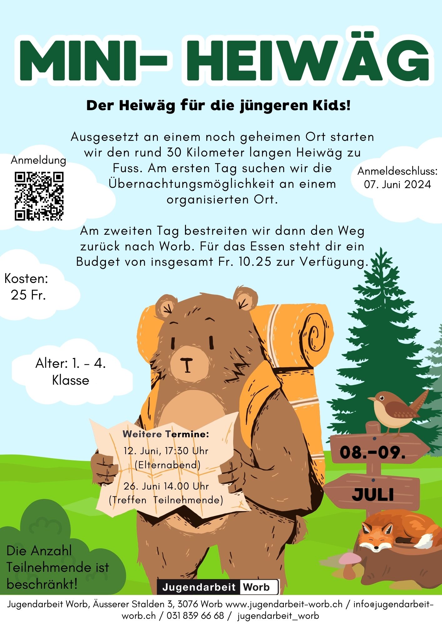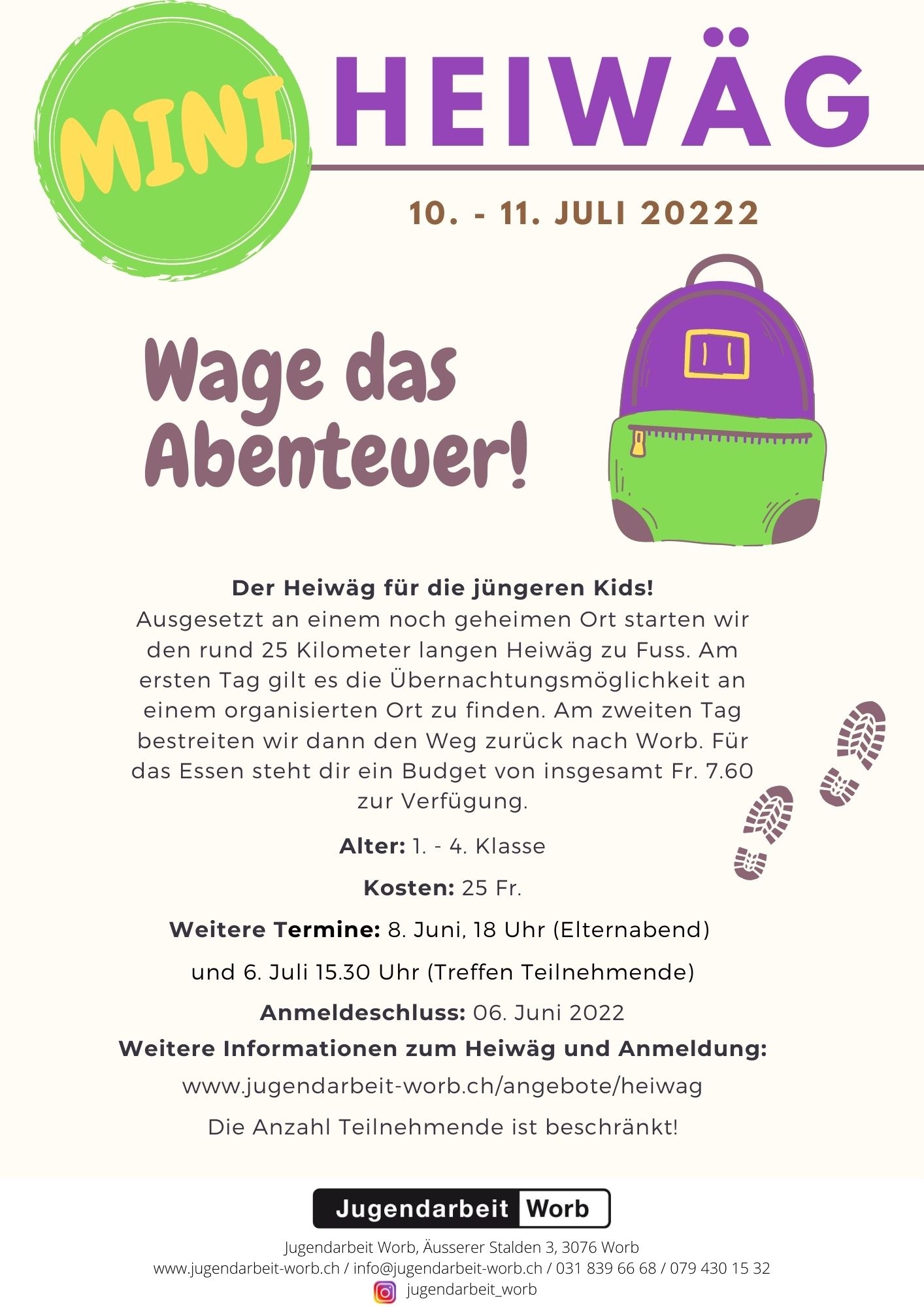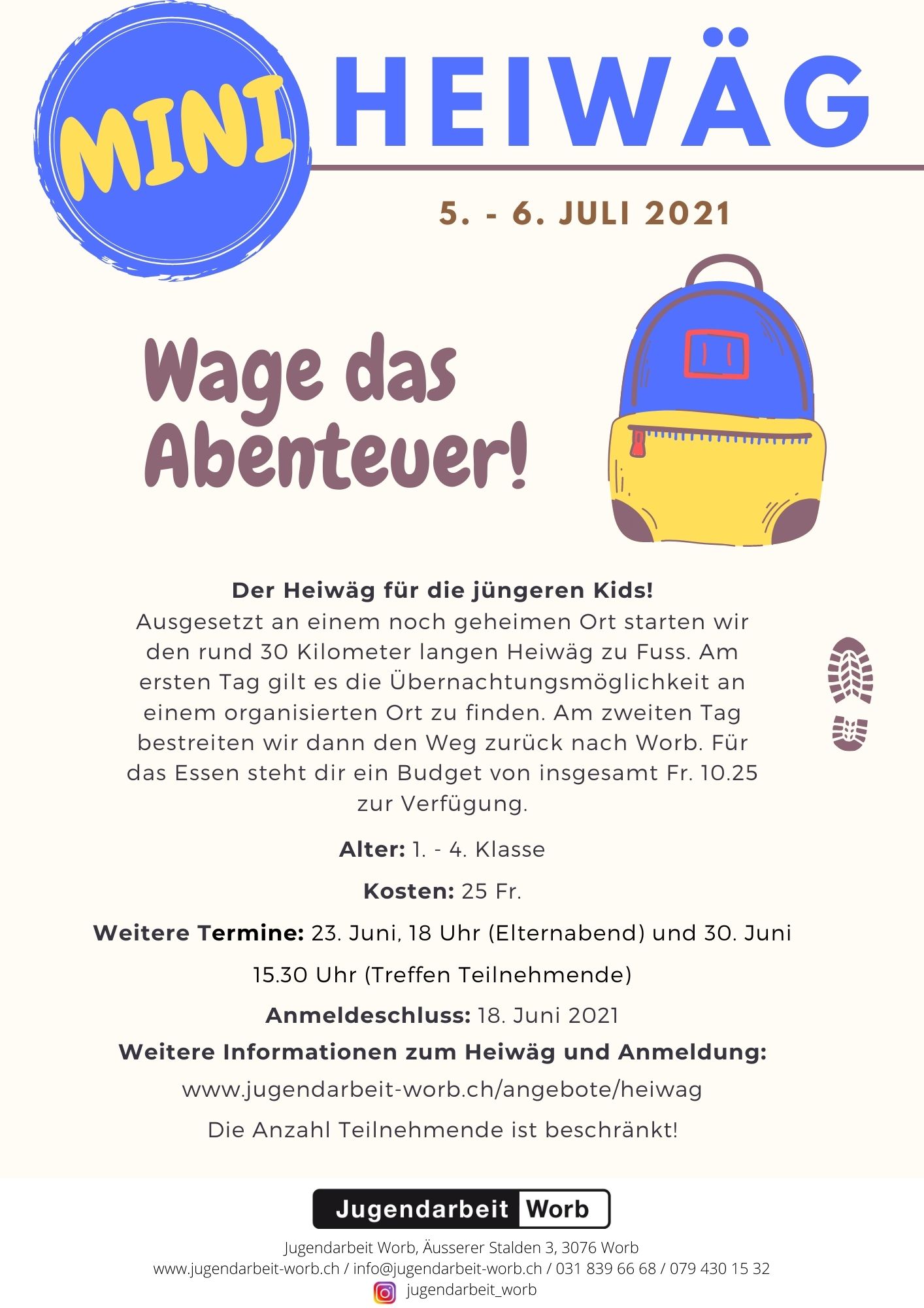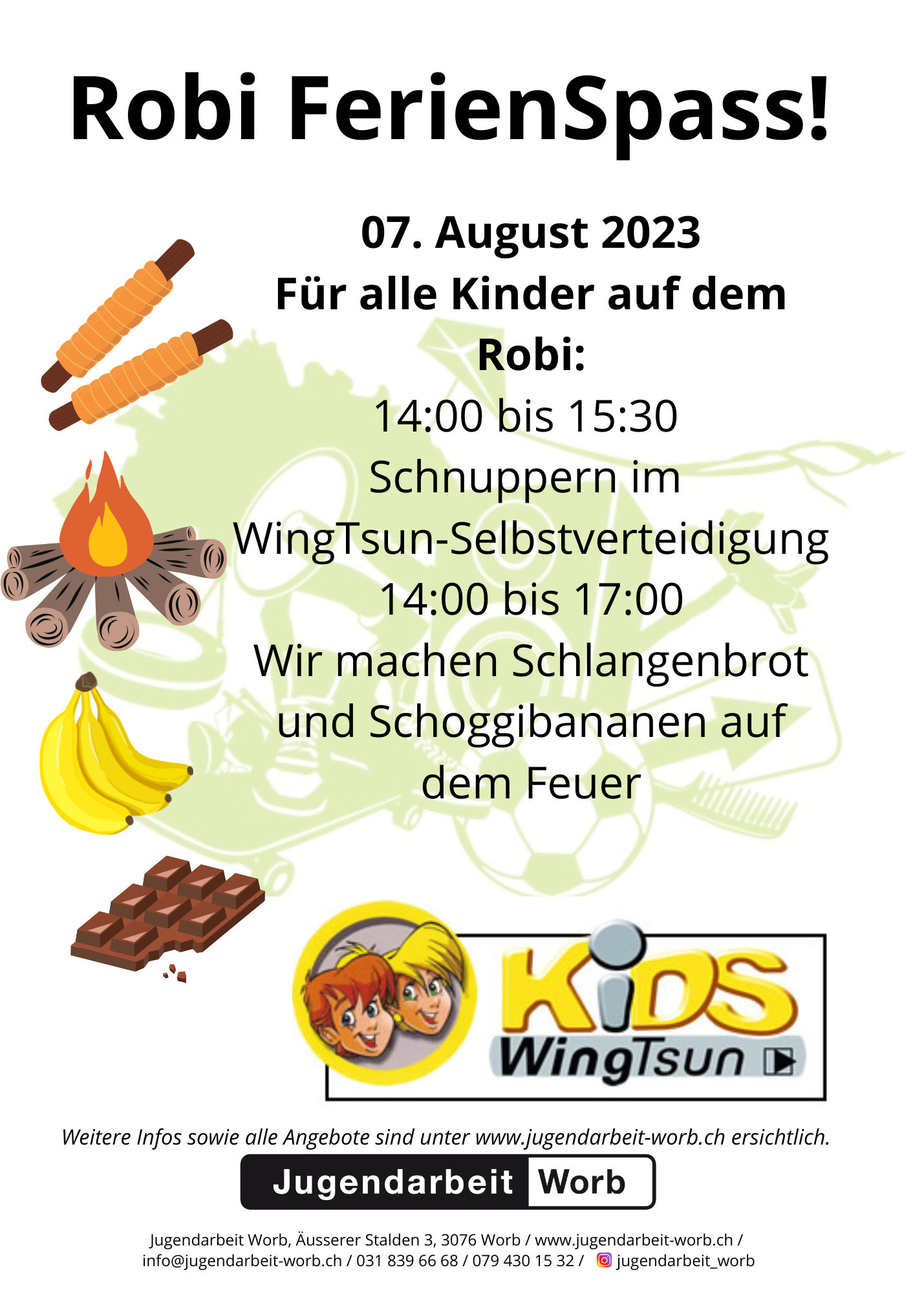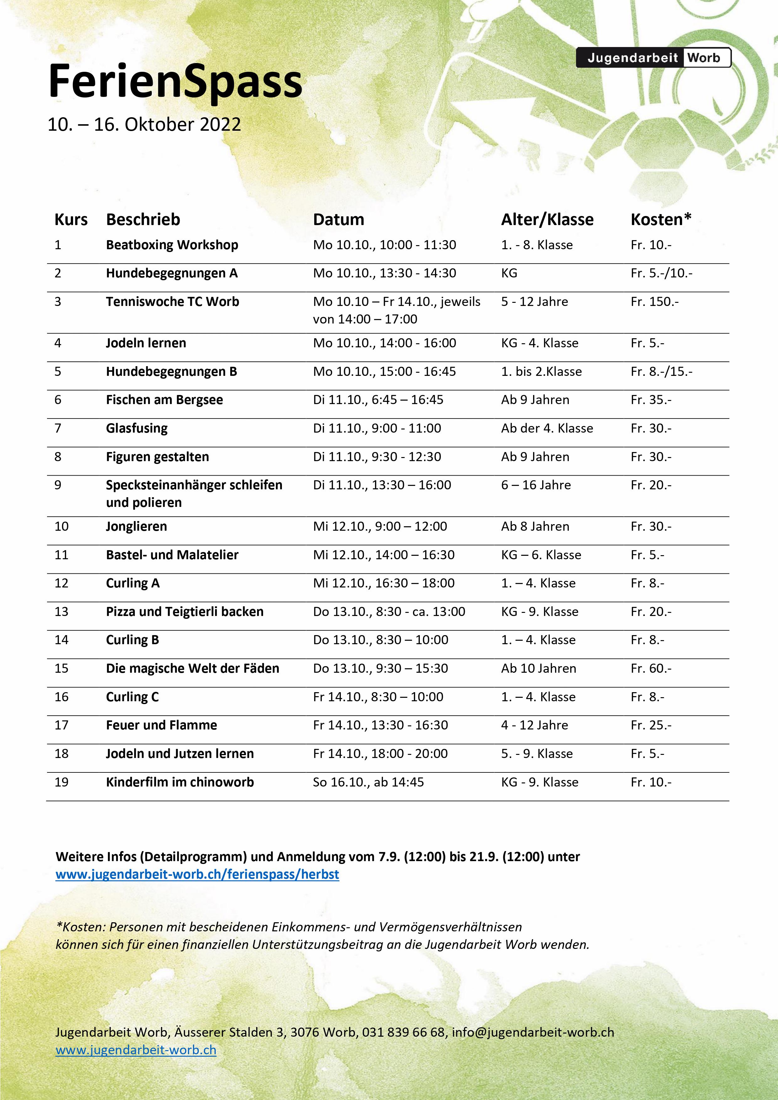 FlyerDer FerienSpass Herbst 2025 bietet Abwechslung! Kreativität, Bewegung und Neugier sind gefragt! Die offene Kinder- und Jugendarbeit Worb organisiert vom Montag, 06. Oktober bis Sonntag, 12. Oktober 2025 ein FerienSpass-Angebot für alle Kinder und Jugendlichen der Gemeinde Worb ab dem Kindergarten bis zur 9. Klasse. Melde dich baldmöglichst an und nutze die letzte Herbstferienwoche, um eine abwechslungs-reiche und spannende Zeit zu erleben!