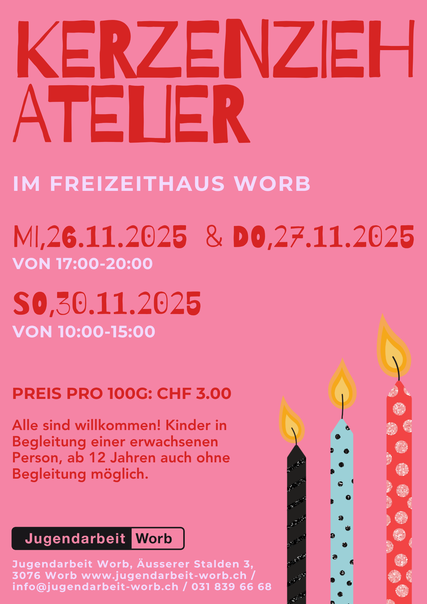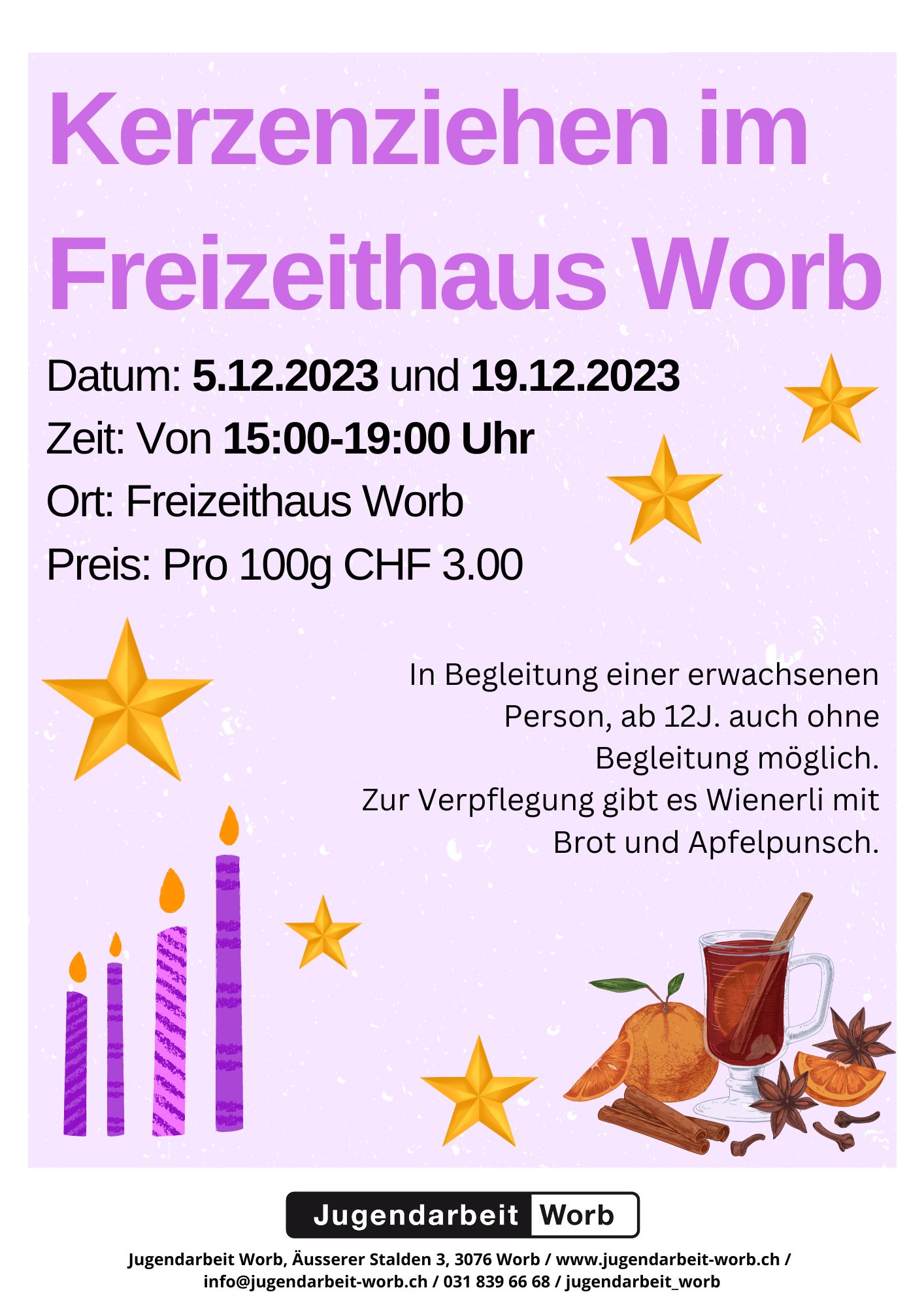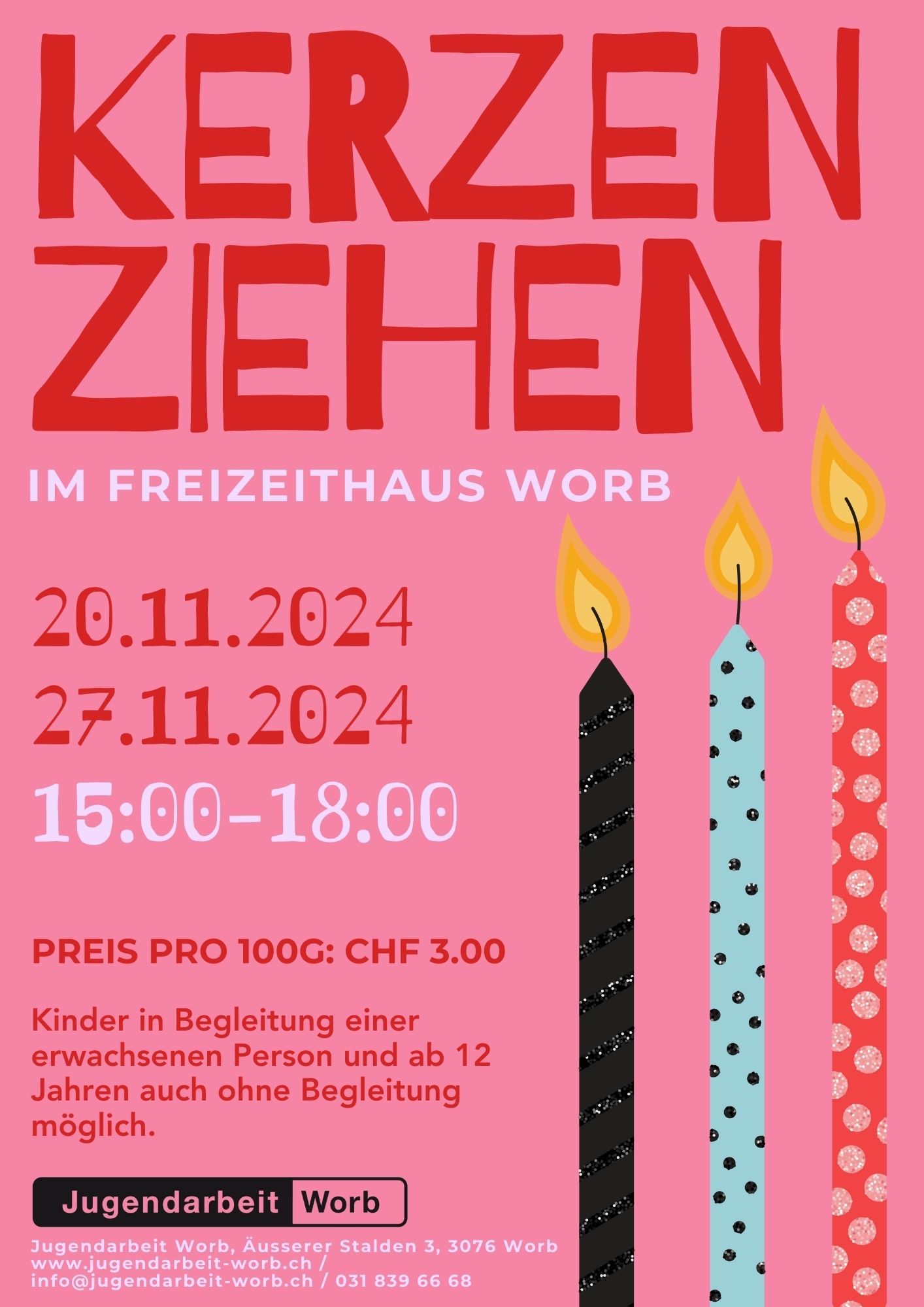 FlyerKomm vorbei und kreiere wunderschöne Kerzen! Pro 100g Wachs kosten die Kerzen CHF 3.00. Alle sind willkommen! Kinder in Begleitung einer erwachsenen Person, ab 12 Jahren auch ohne Begleitung möglich.