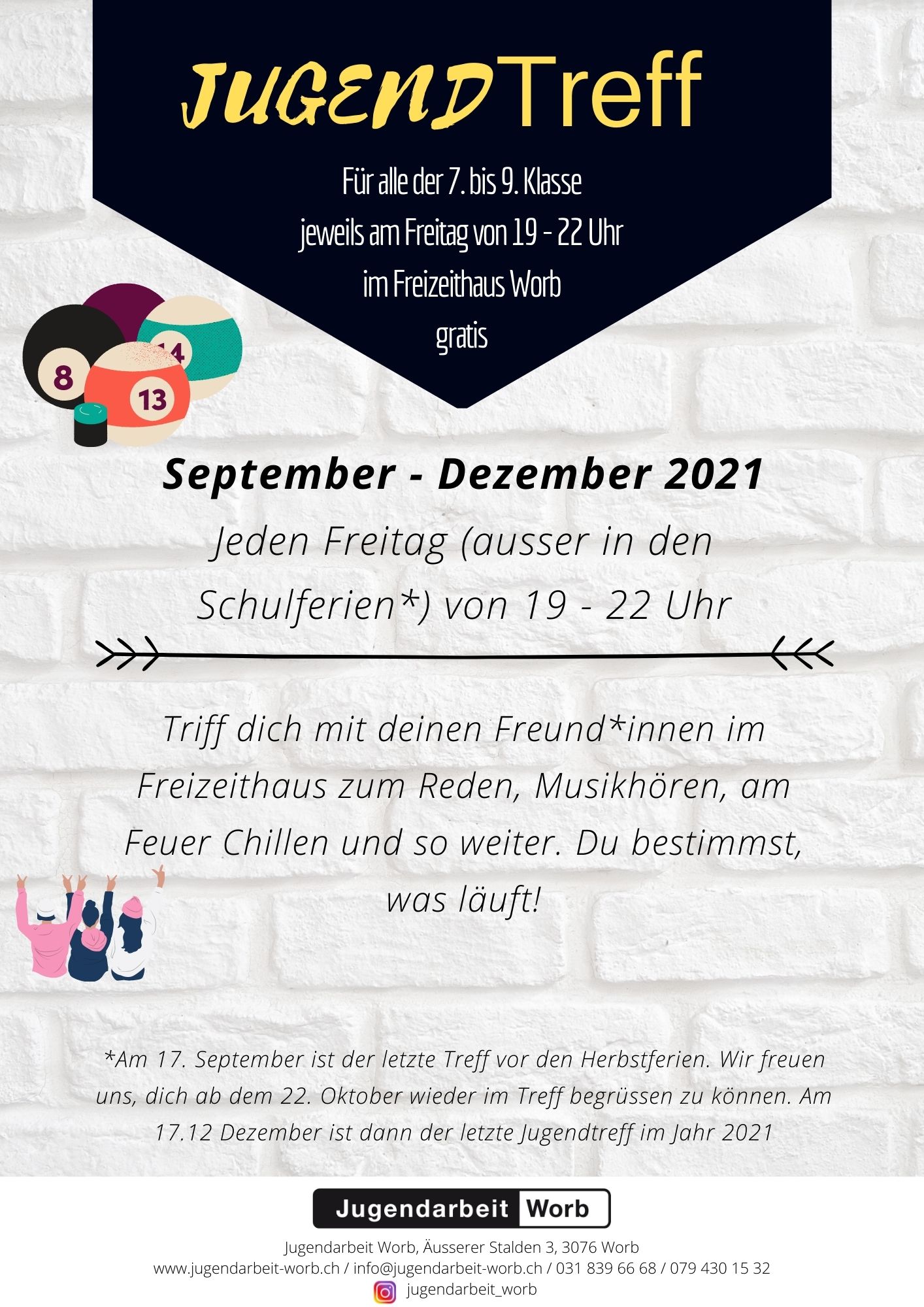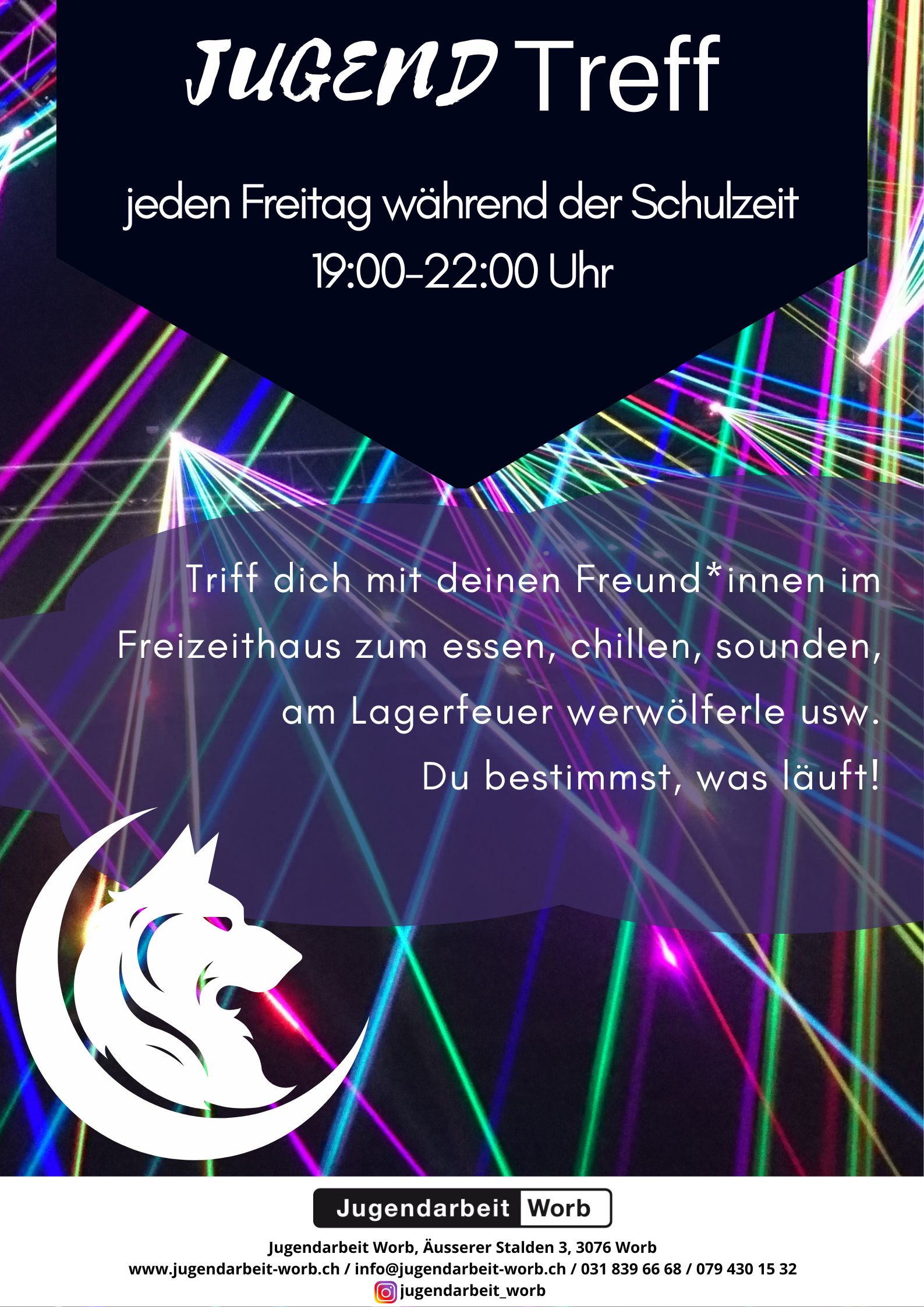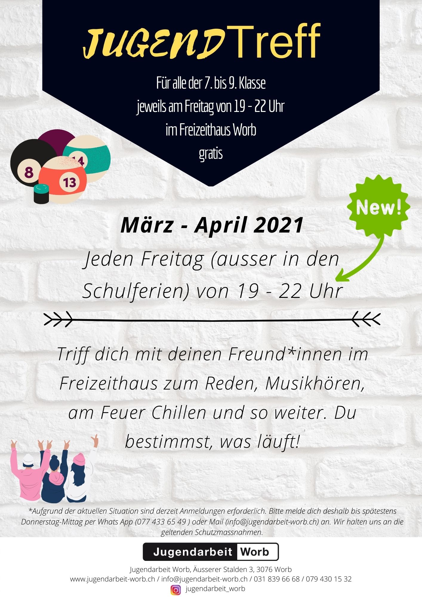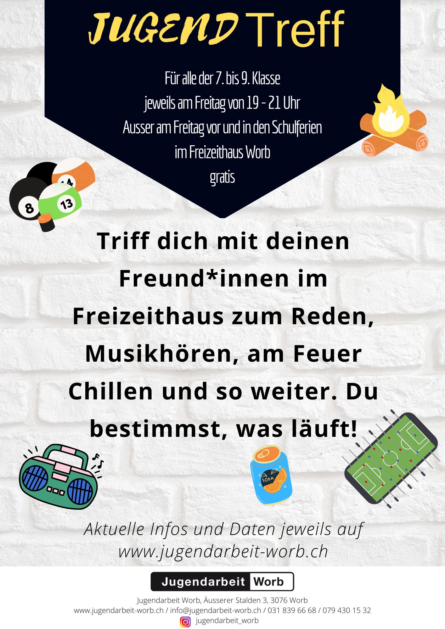 und während der offenen Turnhalle, von 19 bis 22 Uhr im Freizeithaus Worb statt. Die Jugendtreffsaison dauert von den Herbstferien bis zu den Frühlingsferien. Im Halbjahr zwischen Frühlings- und Herbstferien können vereinzelt Anlässe organisert werden.