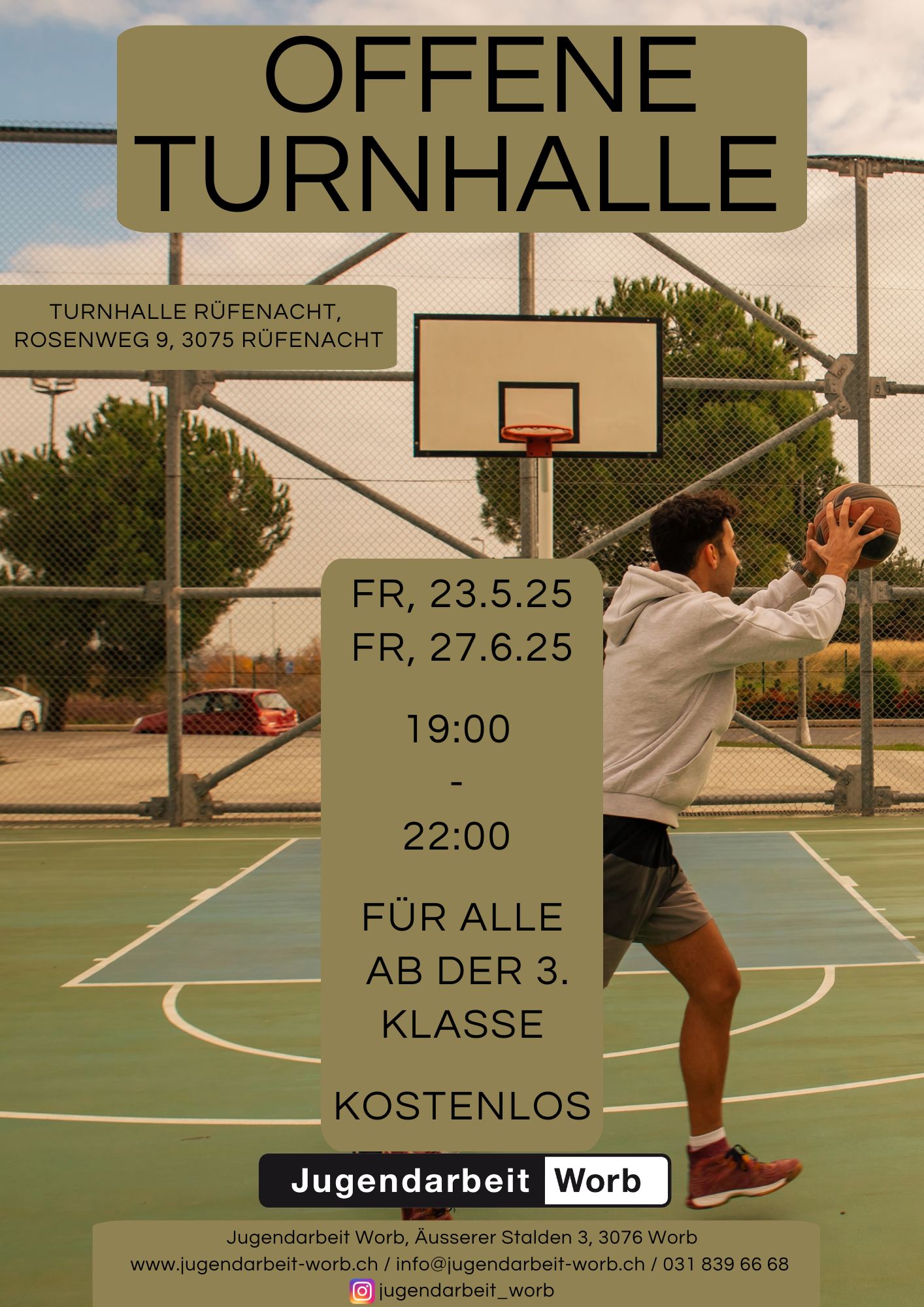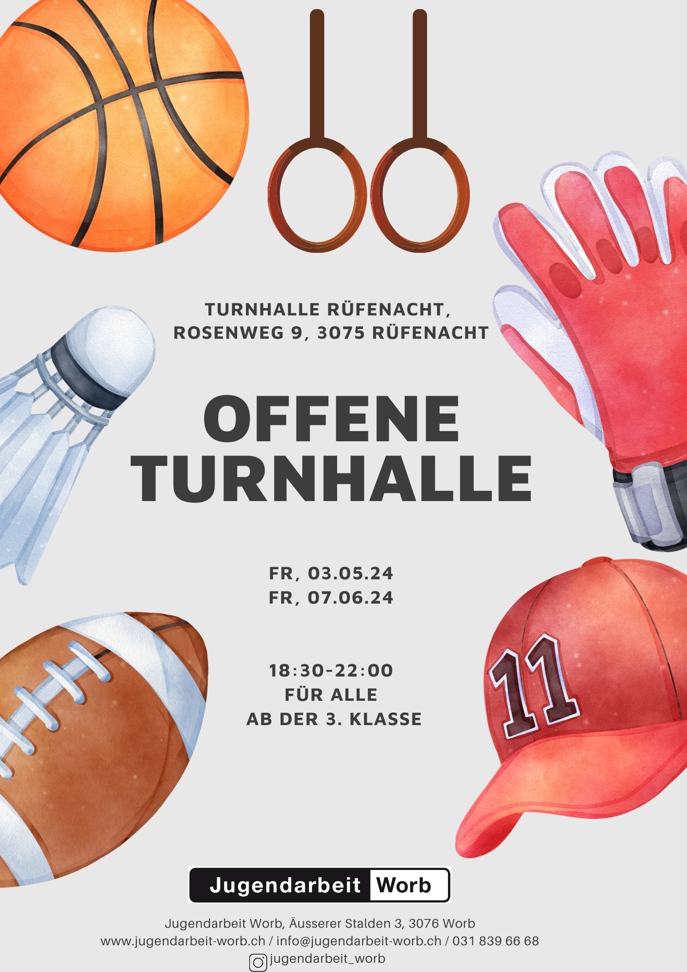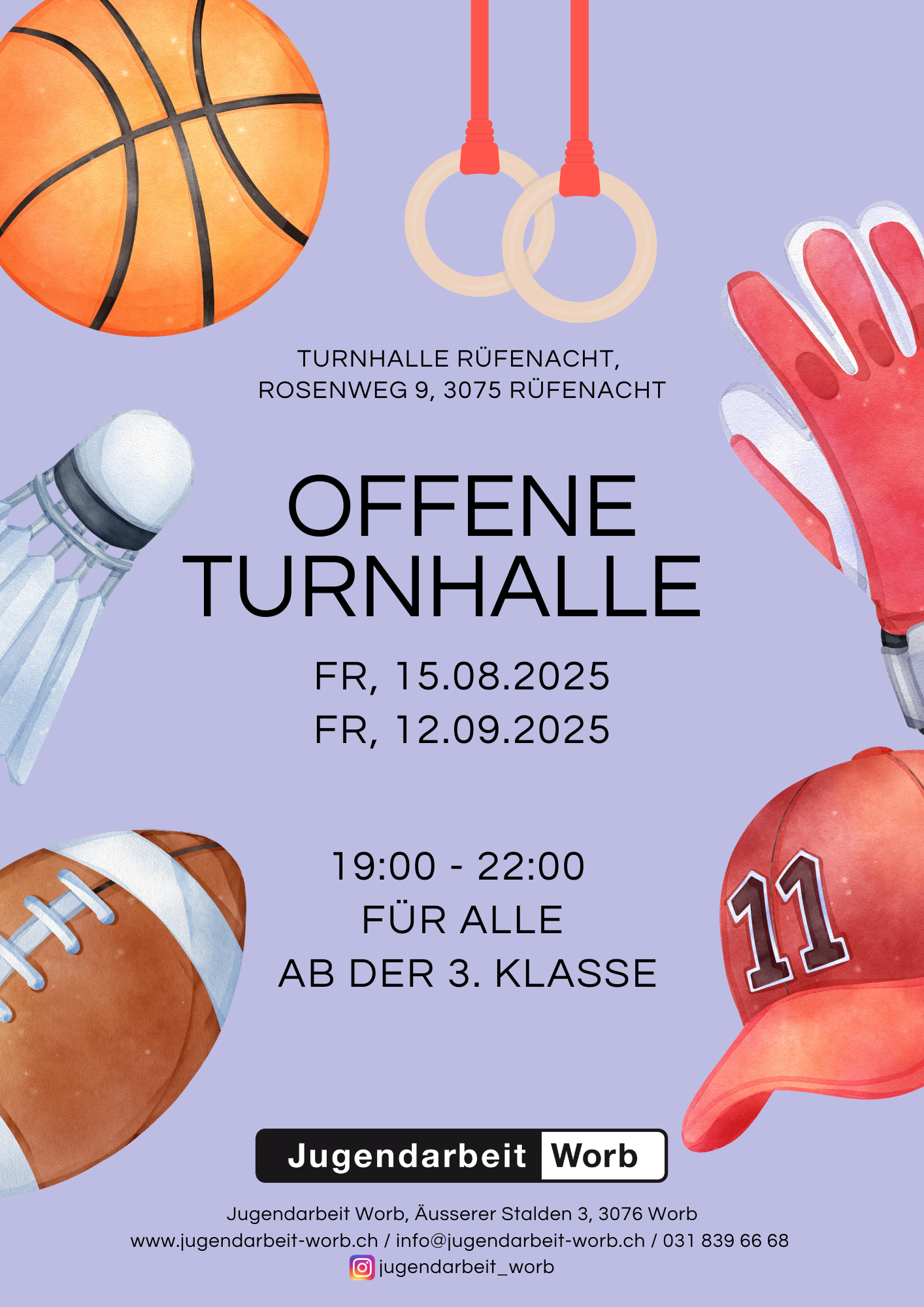 FlyerWir öffnen die Turnhalle in Rüfenacht wieder für euch! Zwischen Oktober 2024 und Juli 2025 findet die offene Turnhalle in Rüfenacht statt. Von 19:00 - 22:00 Uhr für alle Kinder und Jugendlichen ab der 3. Klasse.
