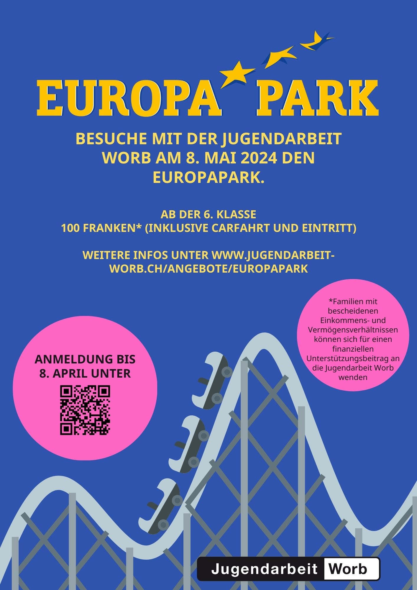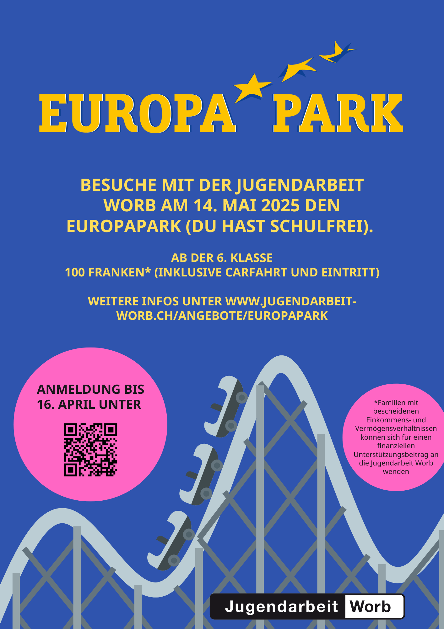 Flyer Jugendtreff April - Juli 25Besuche mit der Jugendarbeit den Europapark in Rust und nutze deinen ausserordentlich schulfreien Tag perfekt aus! :-)