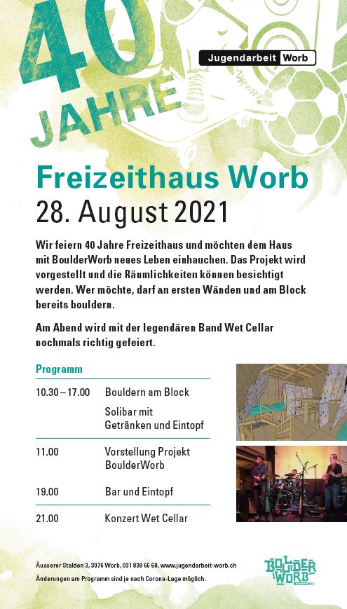 Als 2018 die Boulderhalle „Zäziboulder“ in Zäziwil ihre Tore schliessen musste und der Besitzer auf der Suche nach einer neuen Bleibe war, entstand ein erster Kontakt zwischen dem Trägerverein Jugendarbeit Worb (TJWO) und Zäziboulder, wobei ein Grossteil des Materials nun im Dachgeschoss vom Freizeithaus gelagert ist. Gemeinsam mit Interessierten soll nun entlang der Bedürfnisse der Bevölkerung das Projekt BoulderWorb entwickelt und erarbeitet werden.