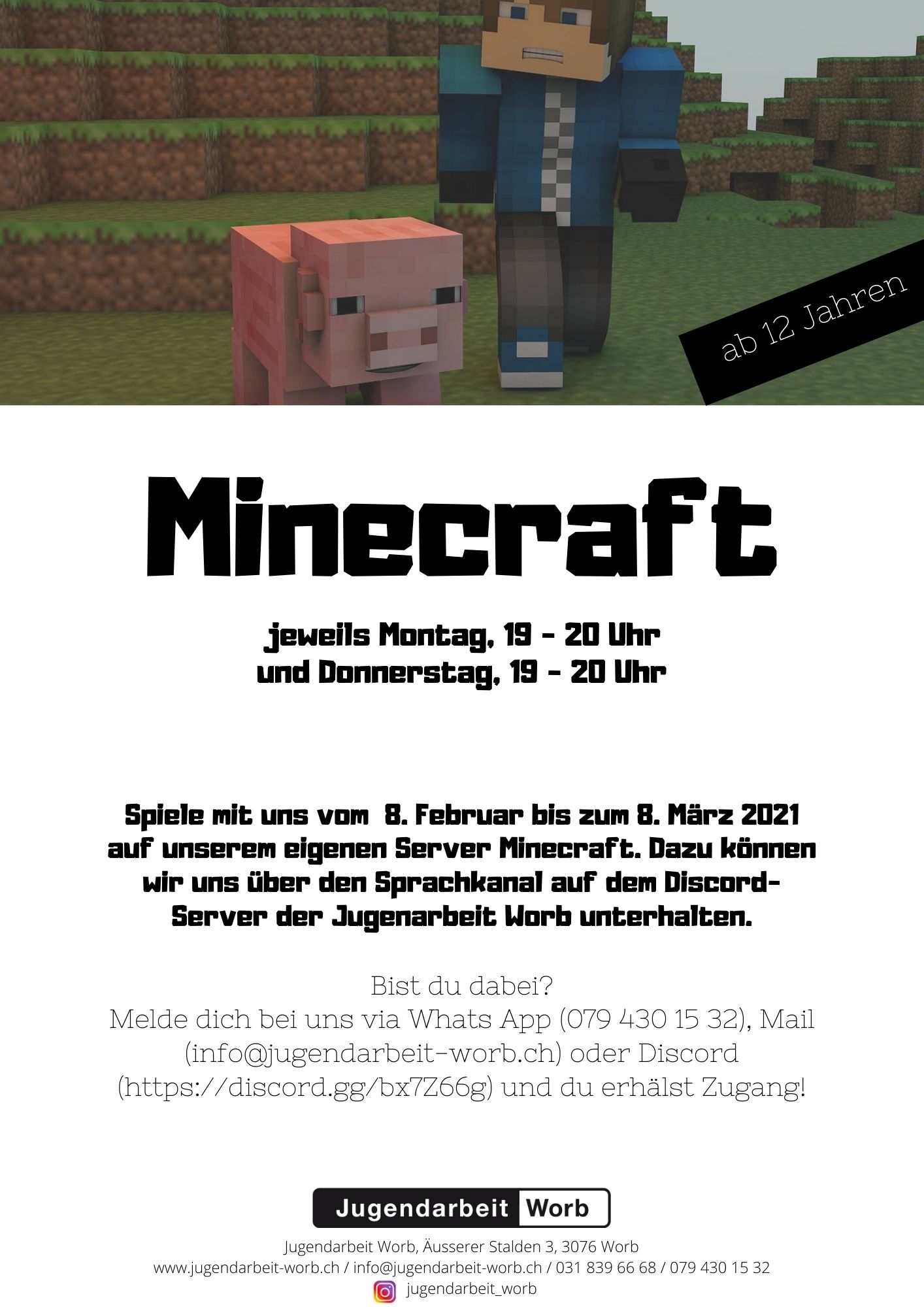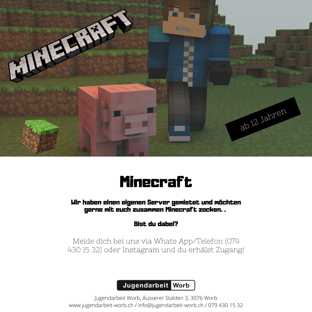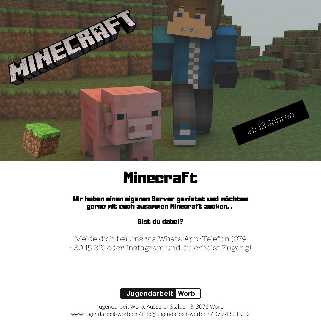 Wir haben einen Server gemietet undmöchten gerne mit euch zusammen Minecraft zocken. Dazu können wir uns über den Sprachkanal bei Discord unterhalten. Melde dich bei uns (Whats App 079 430 15 32 oder via Discord) und du erhälst Zugang! Mindestalter: 12