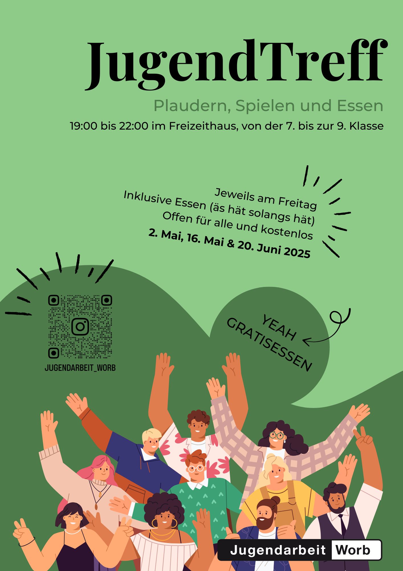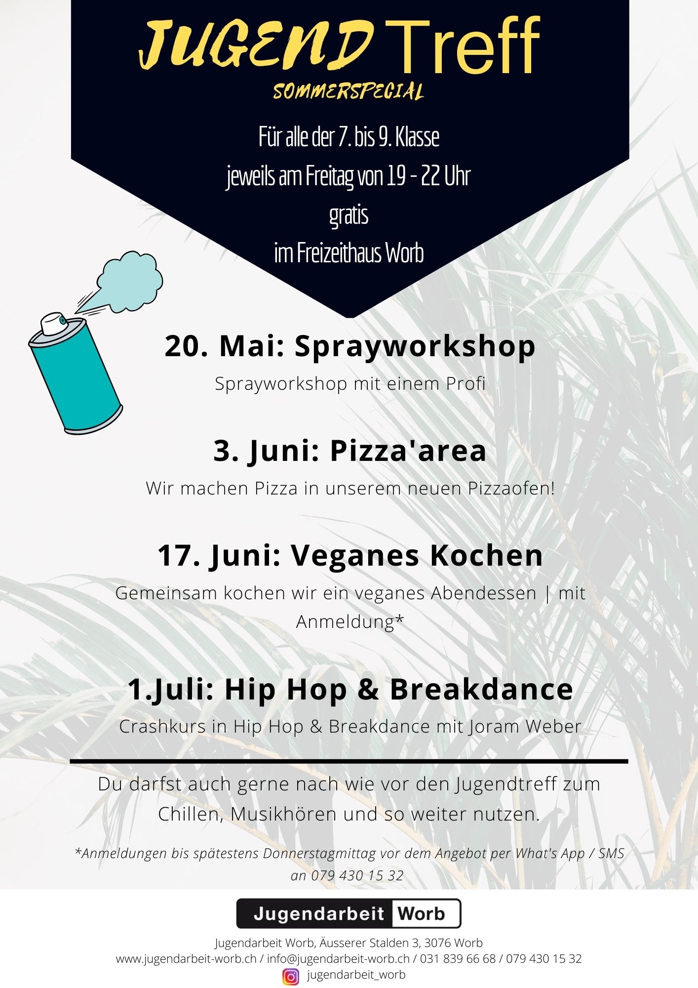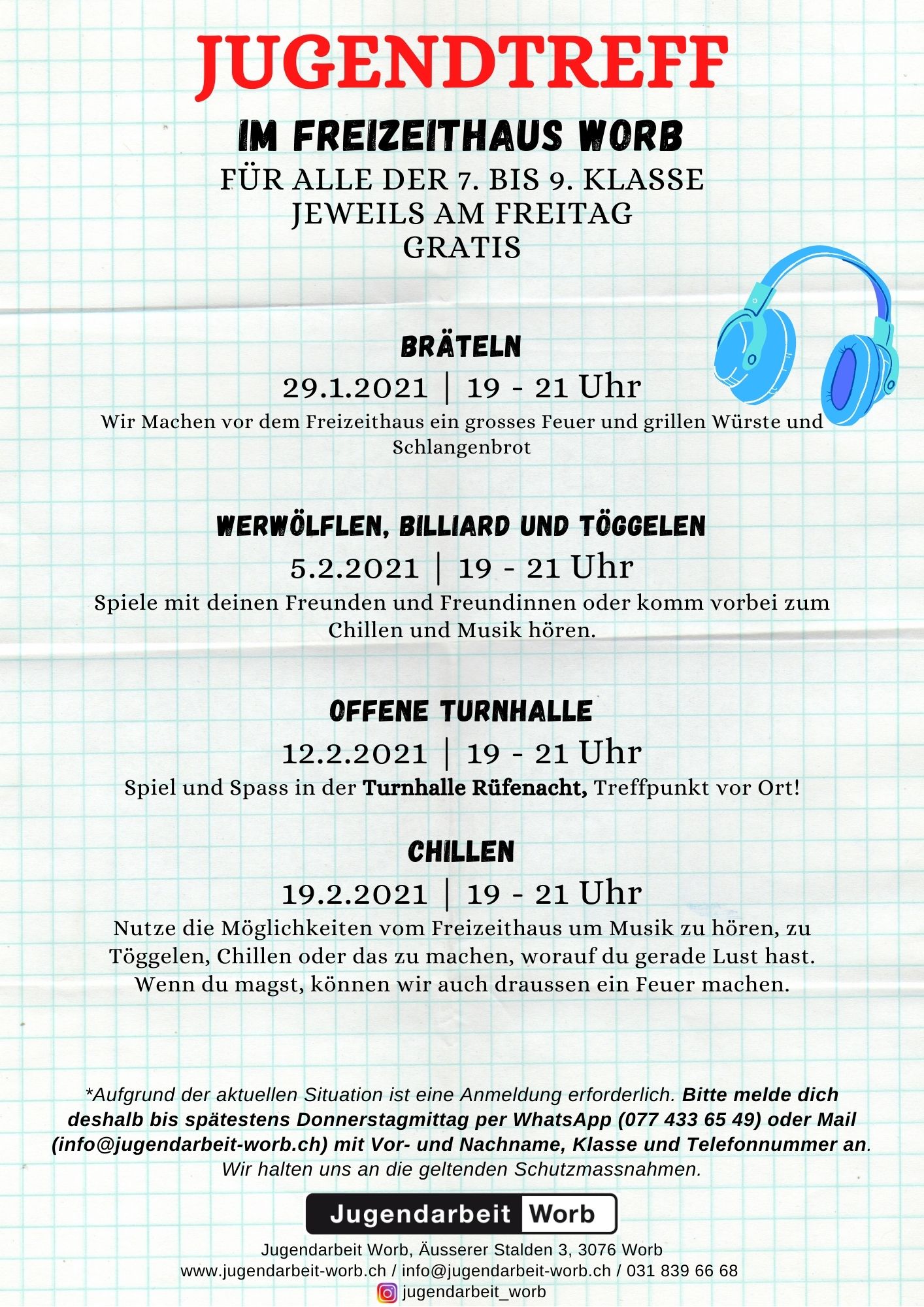 Flyer GenerationenfestEtwa jeden zweiten Freitag von 19:00 - 22:00 Uhr findet der Jugendtreff im Freizeithaus Worb statt. Dabei kochen wir jeweils mit den Jugendlichen zusammen ein Abendessen. Das Angebot ist kostenlos.