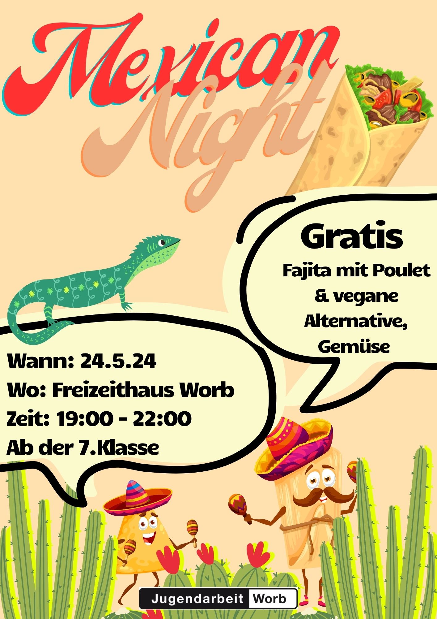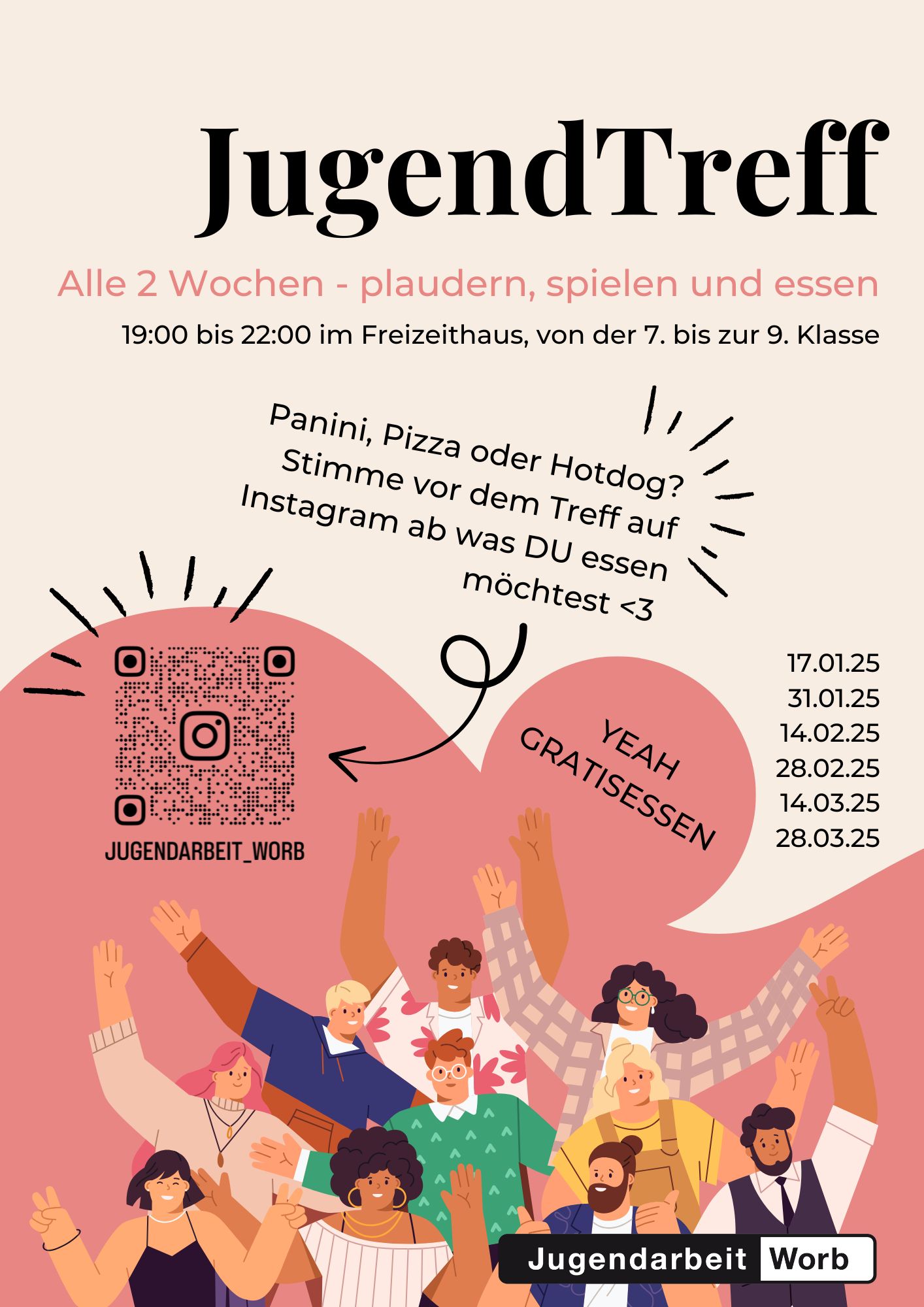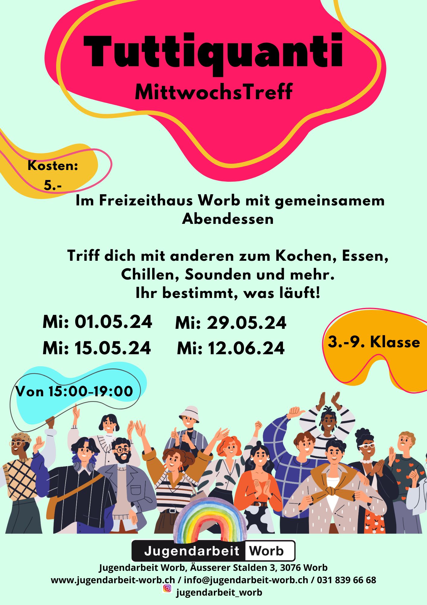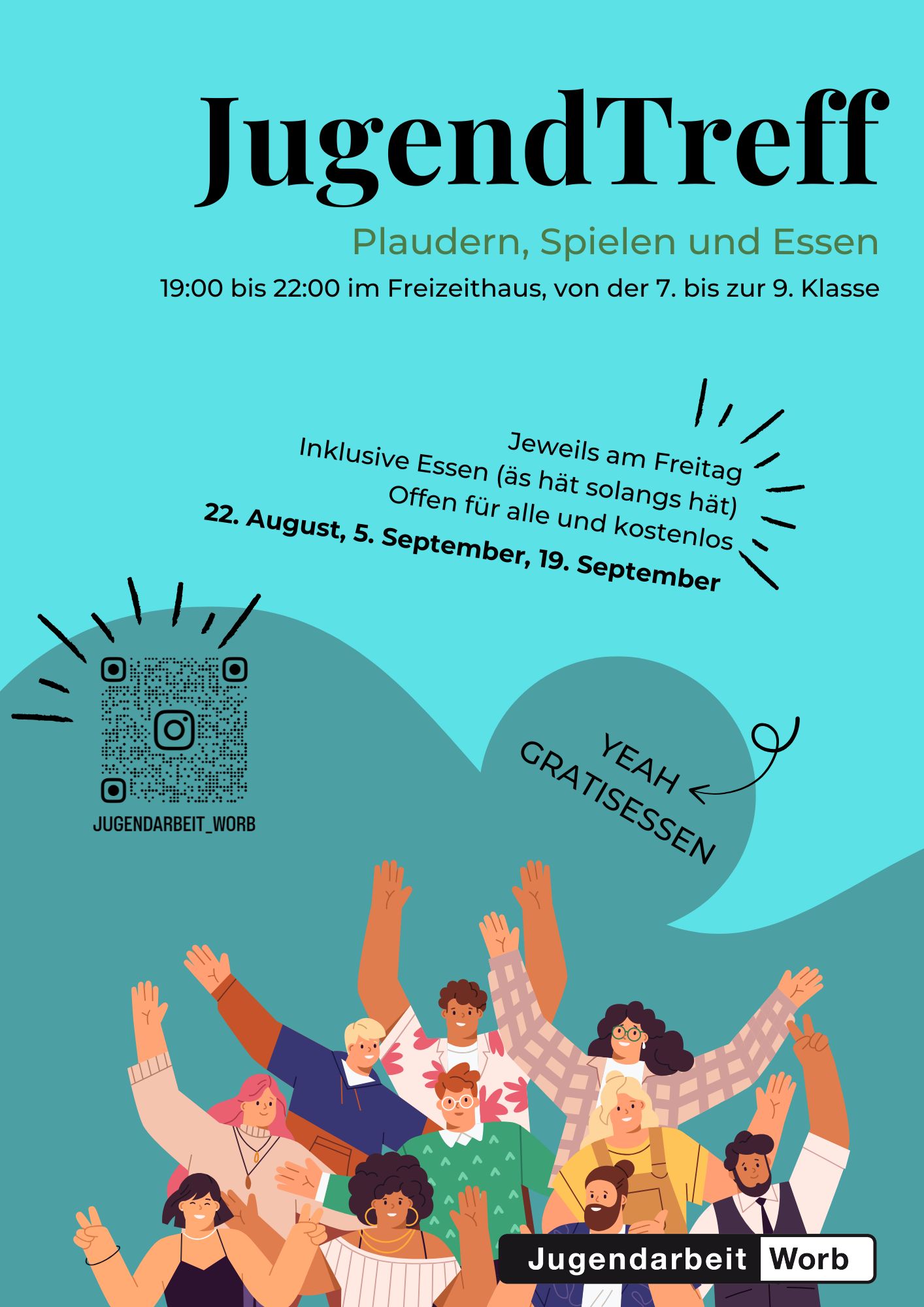 Flyer GenerationenfestEtwa jeden zweiten Freitag von 19:00 - 22:00 Uhr findet der Jugendtreff im Freizeithaus Worb statt. Dabei kochen wir jeweils mit den Jugendlichen zusammen ein Abendessen. Das Angebot ist kostenlos.