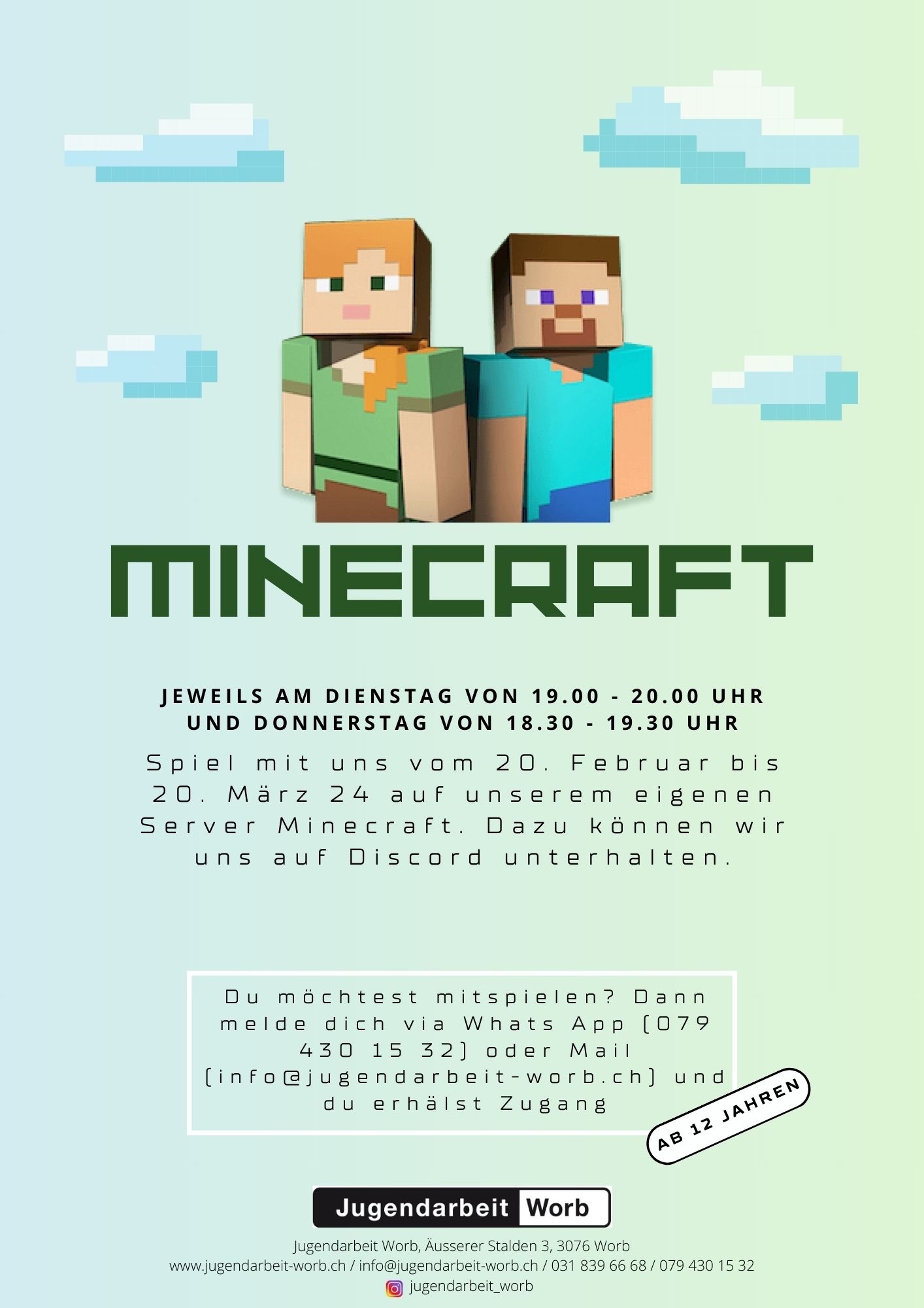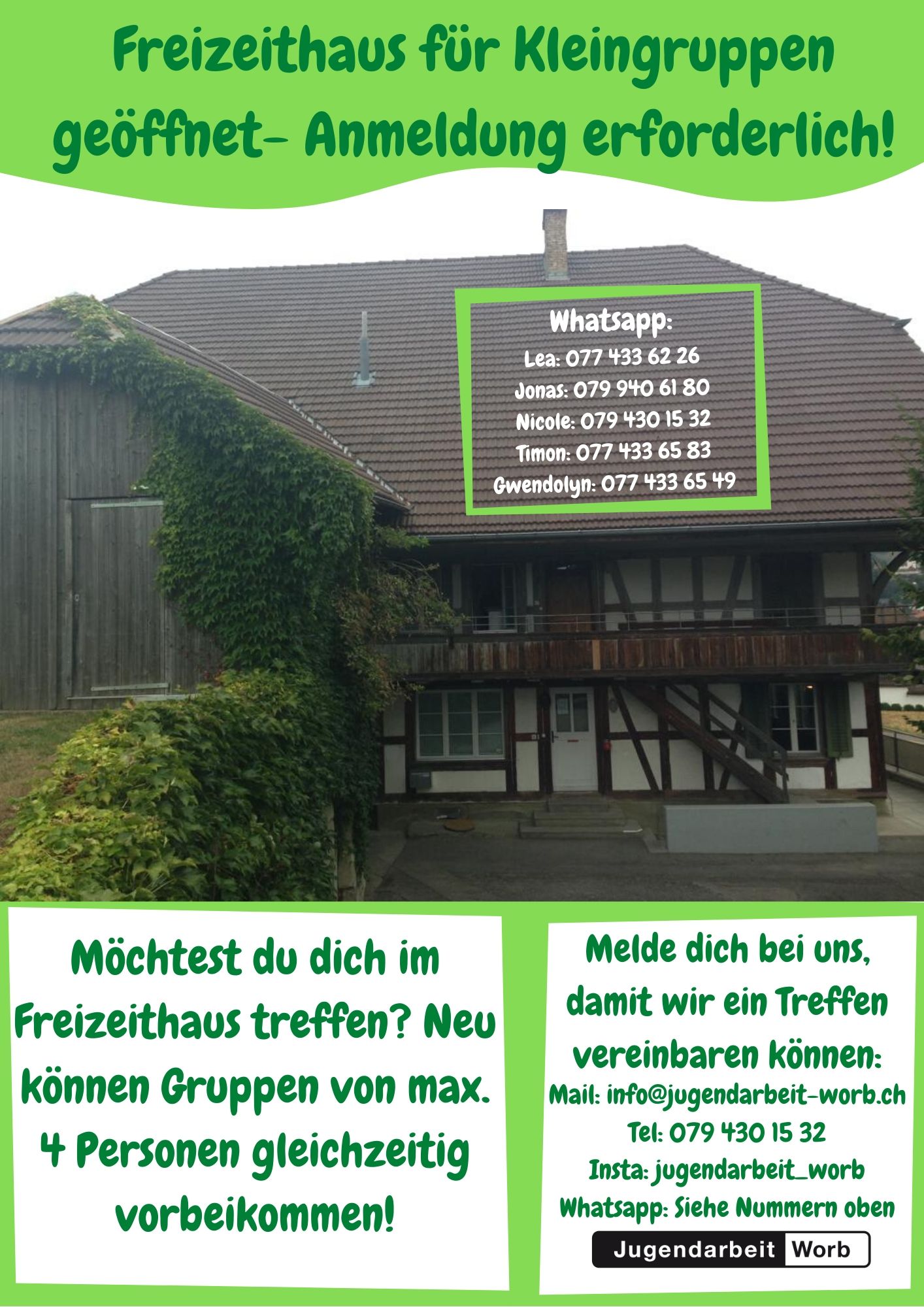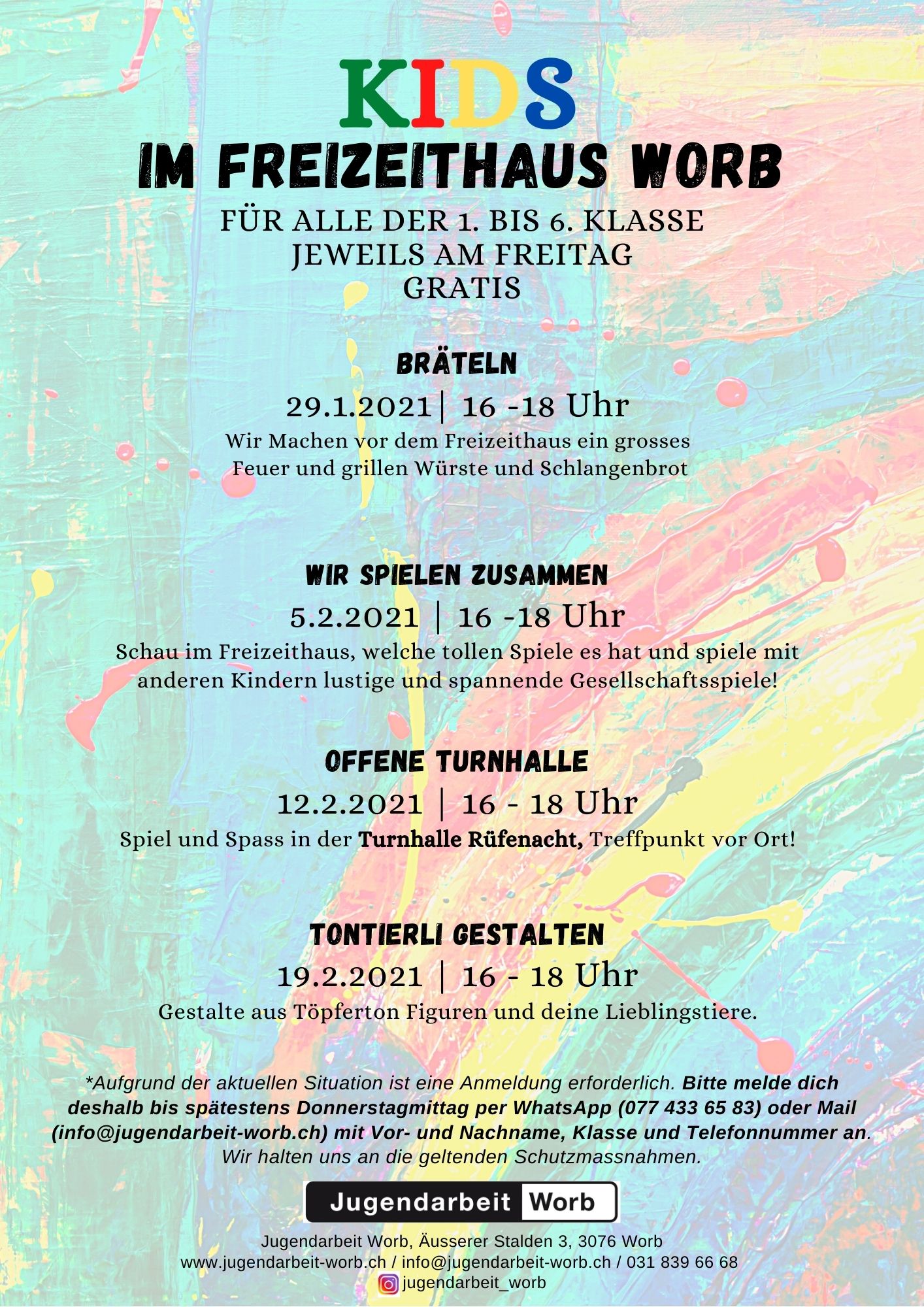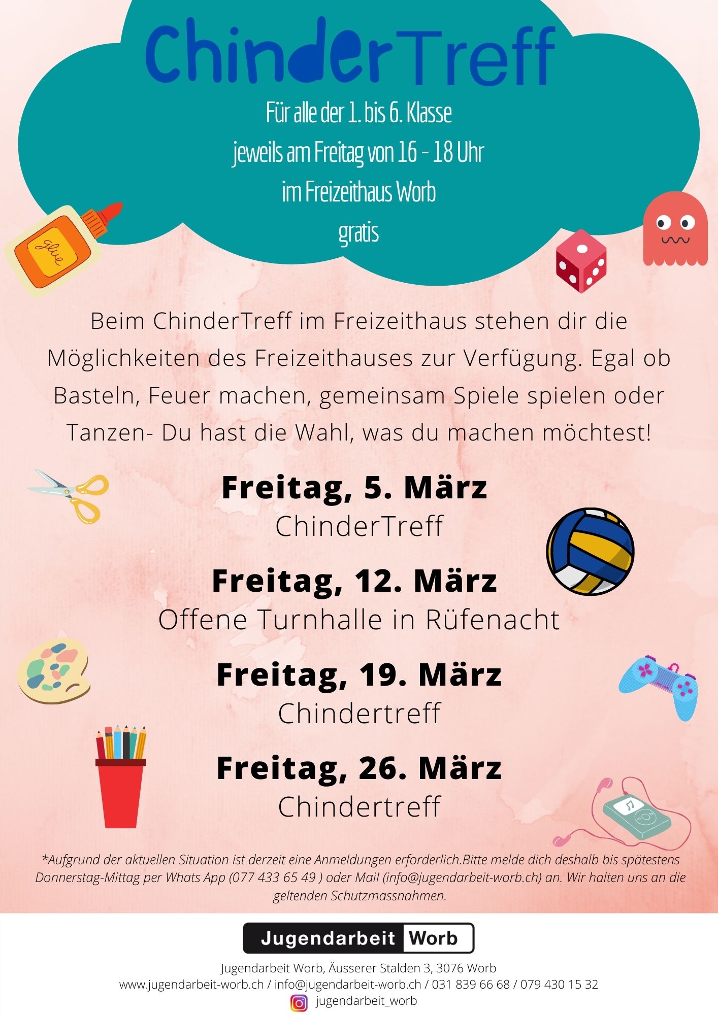 Die Jugendarbeit Worb ist weiterhin per Mail (info@jugendarbeit-worb.ch), über 031 839 66 68 und immer über 079 430 15 32 erreichbar. Die aktuellsten Informationen online: www.jugendarbeit-worb.ch.