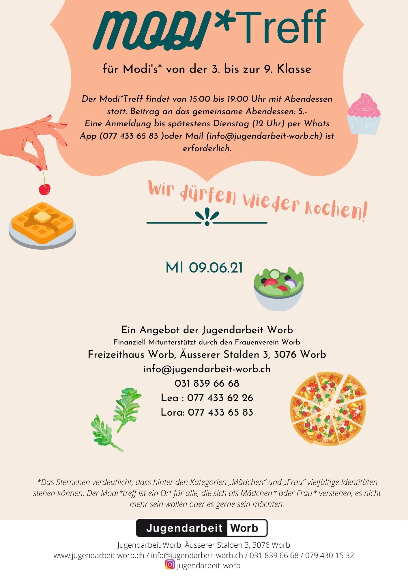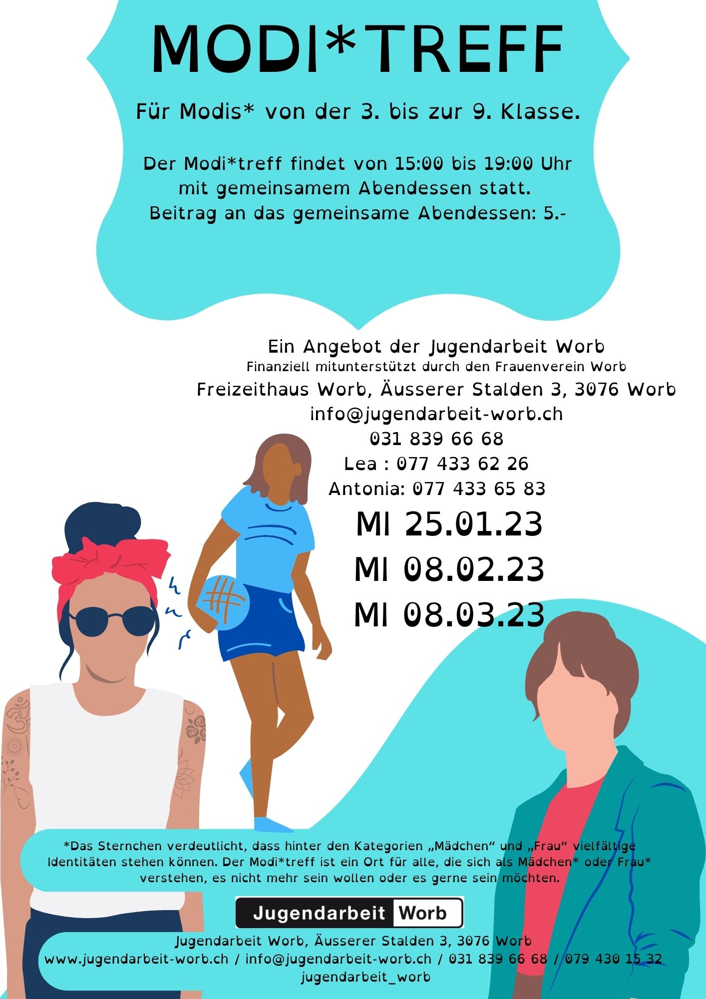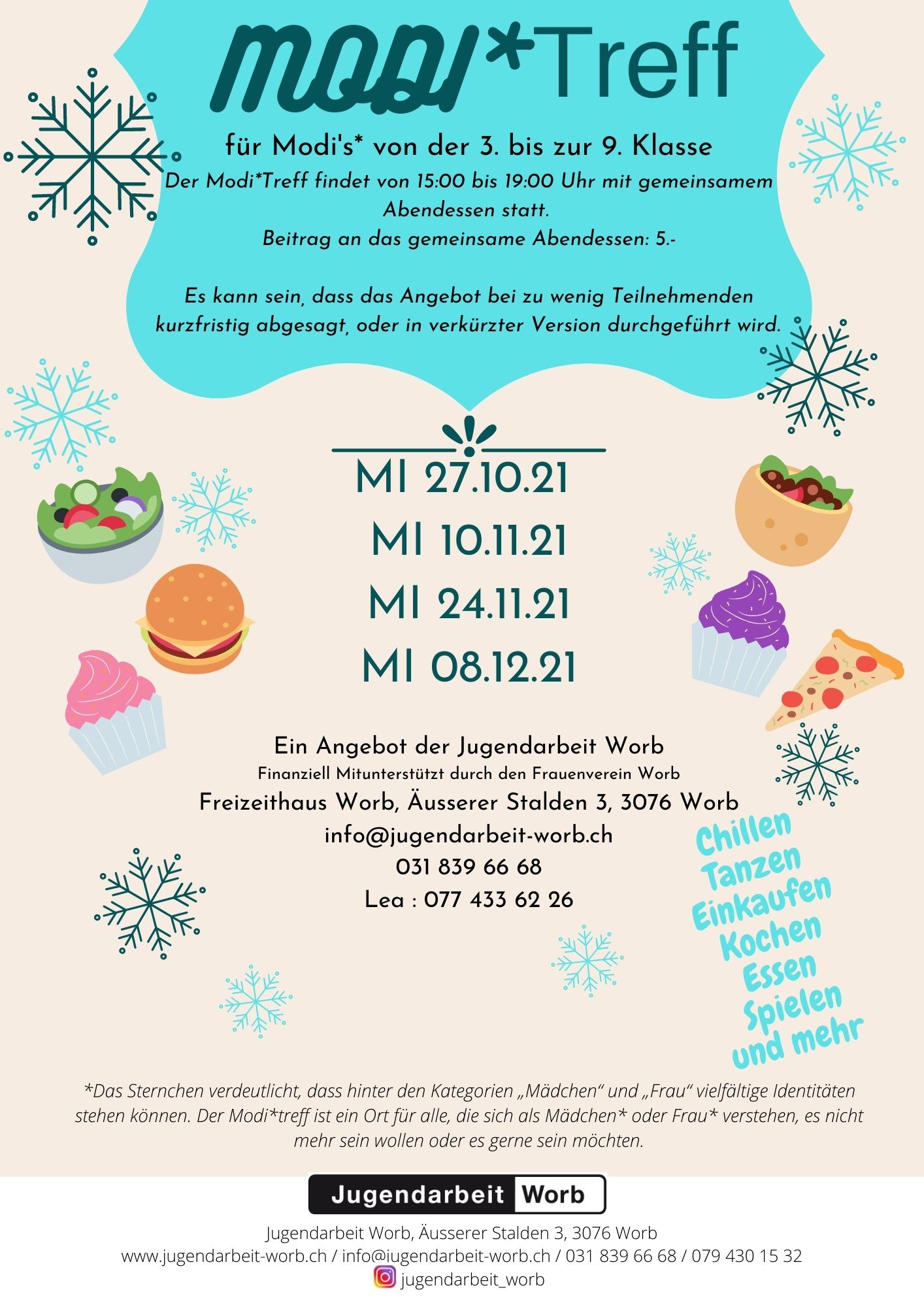 FlyerZweimal im Monat findet am Mittwoch während der Schulzeit im Freizeithaus der Modi*Treff statt. Der Modi*Treff richtet sich an Mädchen* der 3. bis 9. Klasse. Die Treffs bieten Raum, um genderspezifische Themen in einem geschützten Rahmen zu thematisieren. Die Teilnahme am Modi*Treff ist kostenlos.