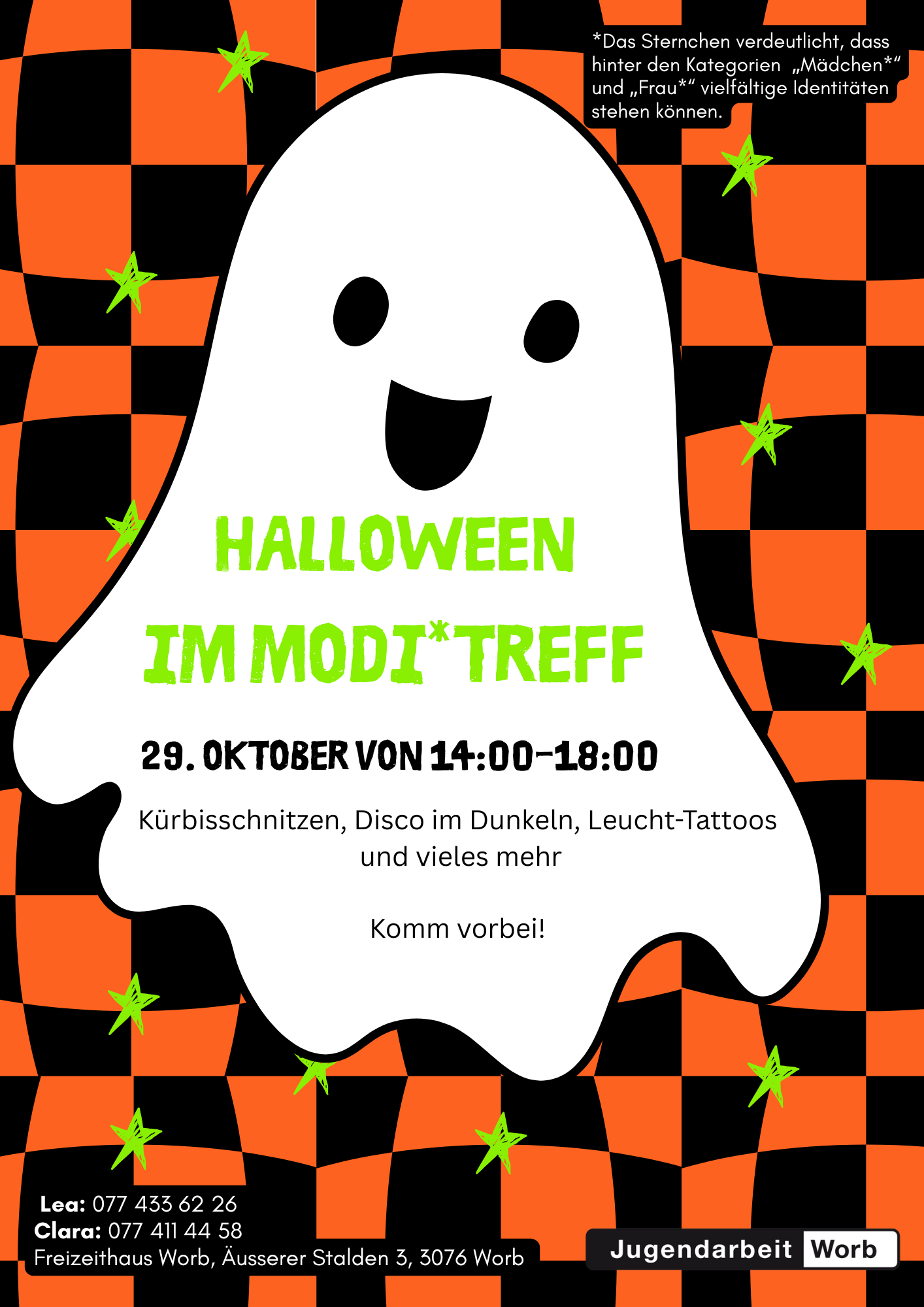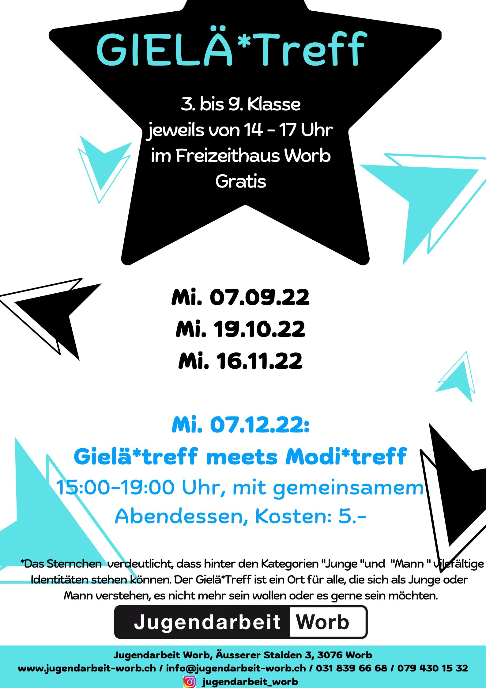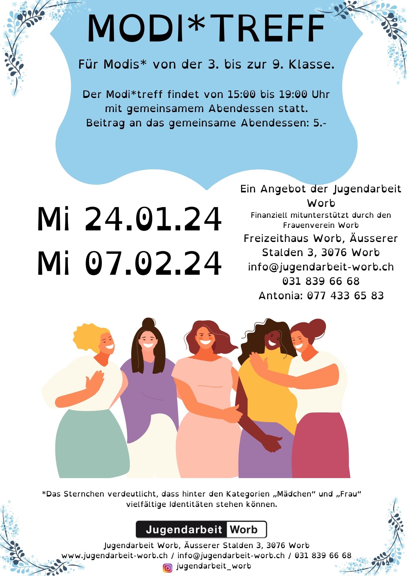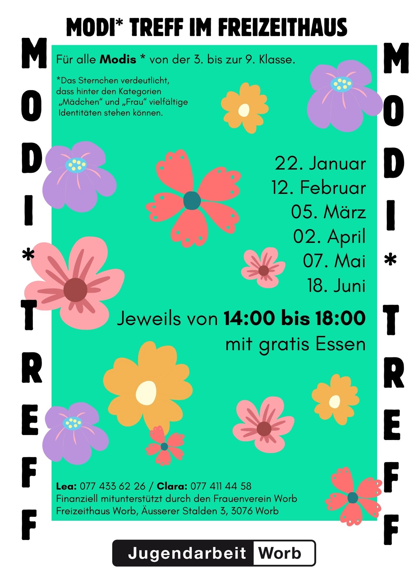 FlyerZweimal im Monat findet am Mittwoch während der Schulzeit im Freizeithaus der Modi*Treff statt. Der Modi*Treff richtet sich an Mädchen* der 3. bis 9. Klasse. Die Treffs bieten Raum, um genderspezifische Themen in einem geschützten Rahmen zu thematisieren. Die Teilnahme am Modi*Treff ist kostenlos.