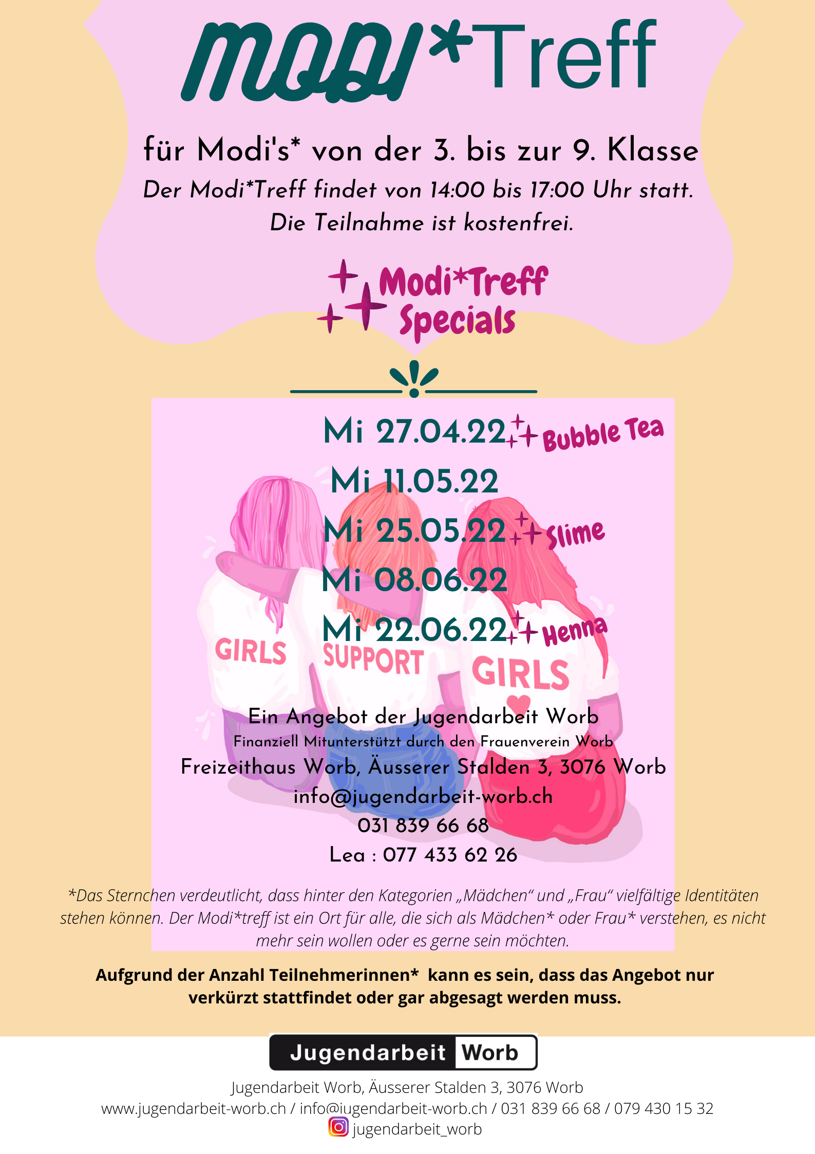 Zweimal im Monat findet am Mittwoch während der Schulzeit im Freizeithaus der Modi*Treff statt. Dieser richtet sich an Mädchen* der 3. bis 9. Klasse. Die Treffs bieten Raum, um genderspezifische Themen in einem geschützten Rahmen zu thematisieren. Die Teilnahme am Modi*Treff ist kostenlos.