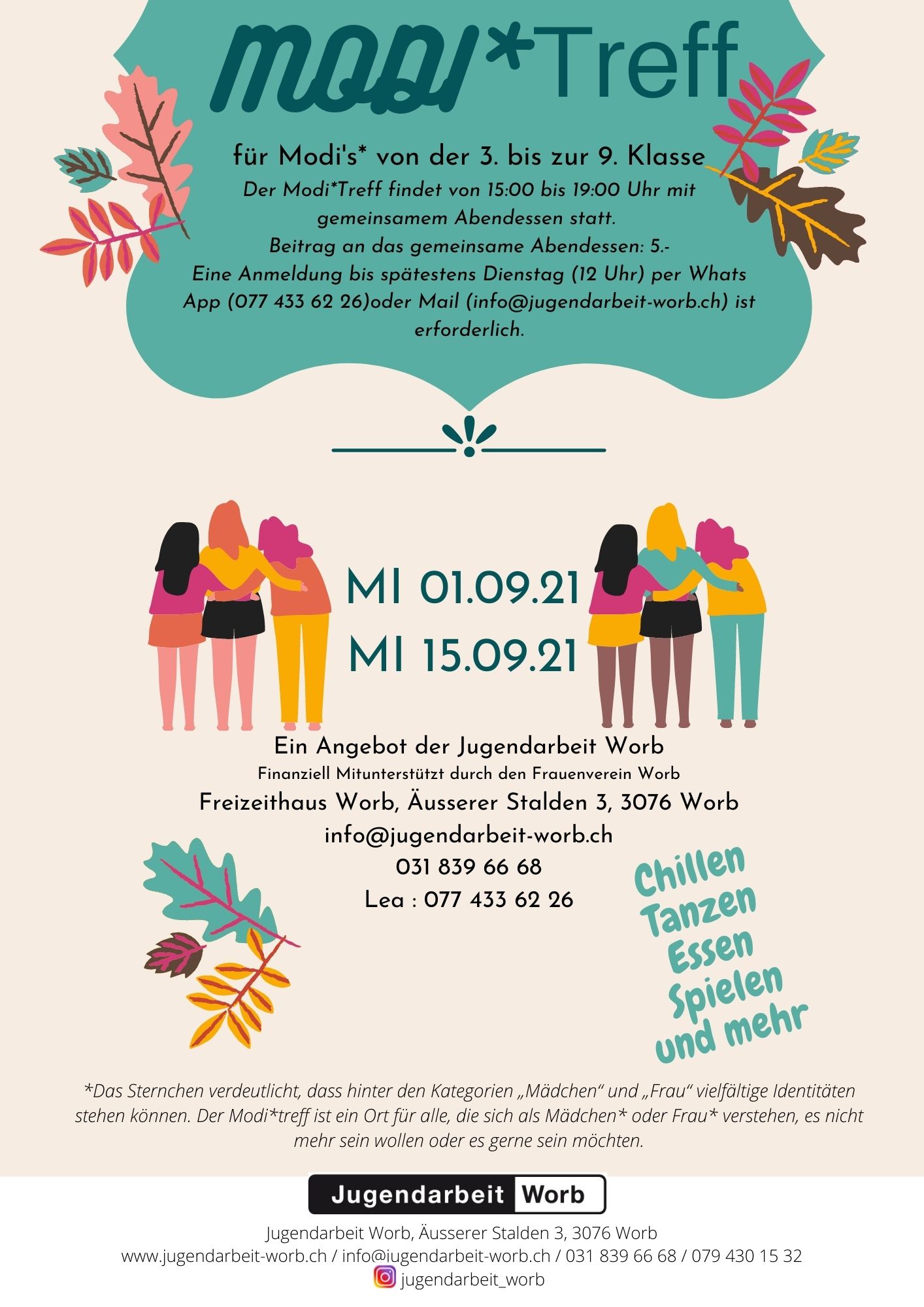 Flyer Jugendtreff August & September 2025Zweimal im Monat findet am Mittwoch während der Schulzeit im Freizeithaus der Modi*Treff statt. Der Modi*Treff richtet sich an Mädchen* der 3. bis 9. Klasse. Die Treffs bieten Raum, um genderspezifische Themen in einem geschützten Rahmen zu thematisieren. Die Teilnahme am Modi*Treff ist kostenlos.