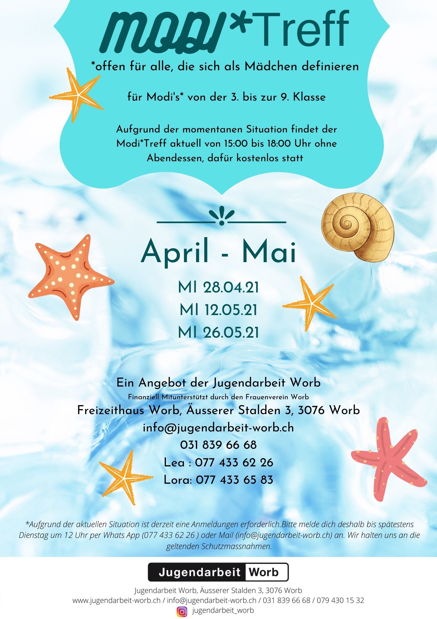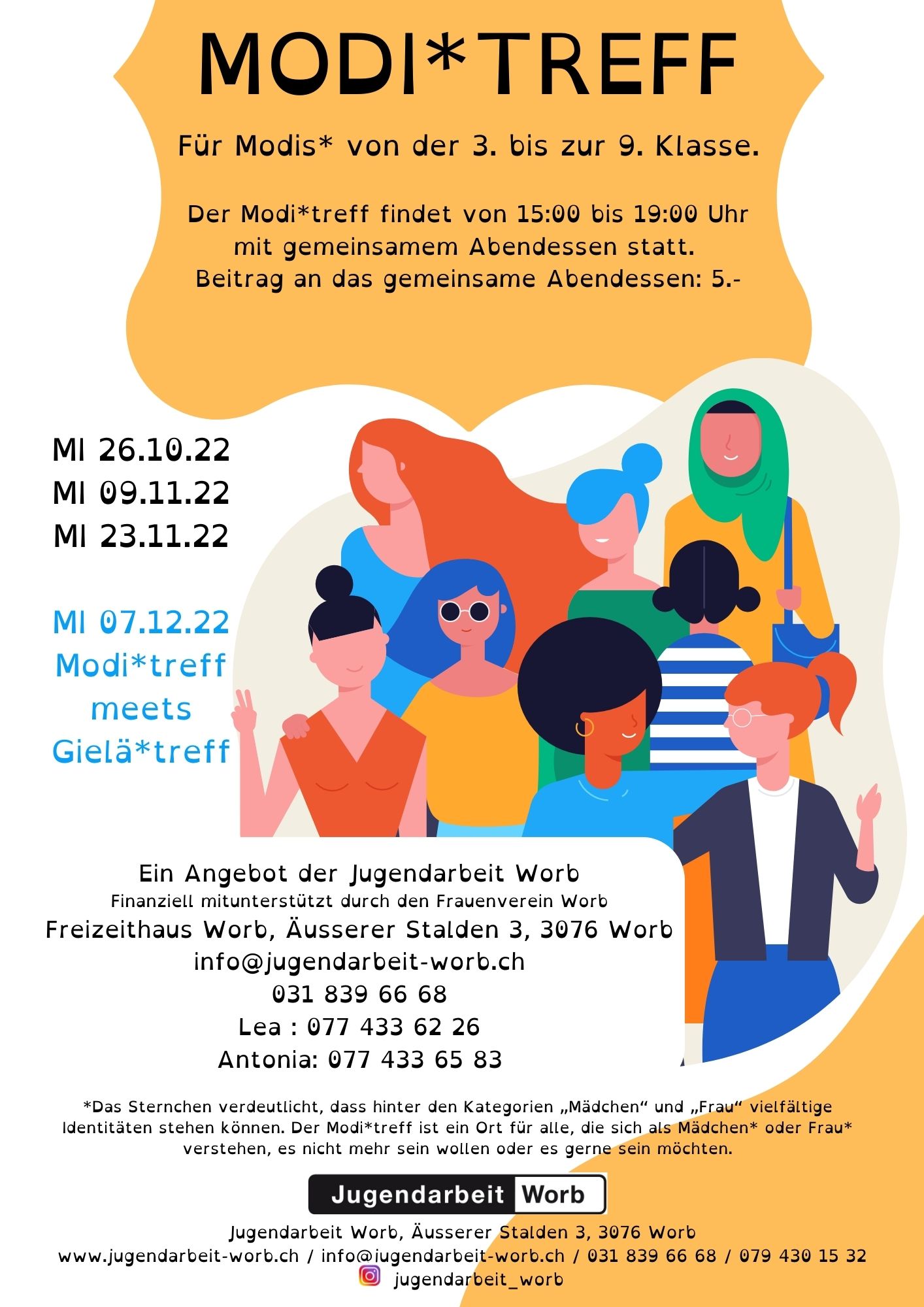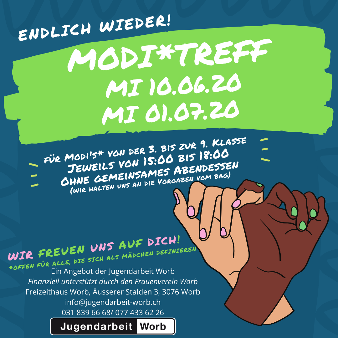 Ungefähr einmal im Monat findet am Mittwoch im Freizeithaus der Modi*Treff statt. Der Modi*Treff richtet sich an Mädchen* der 3. bis 9. Klasse. Die Treffs bieten Raum, um genderspezifische Themen in einem geschützten Rahmen zu thematisieren. Die Teilnahme am Modi*Treff ist kostenlos.