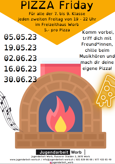 FlyerEtwa jeden zweiten Freitag von 19:00 - 22:00 Uhr findet der Jugendtreff im Freizeithaus Worb statt. Dabei kochen wir jeweils mit den Jugendlichen zusammen ein Abendessen. Das Angebot ist kostenlos.