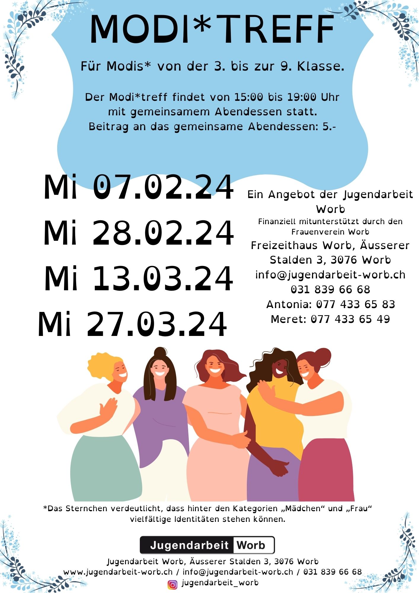 Flyer Bouldertreff April - August 25Ungefähr einmal im Monat findet am Mittwoch im Freizeithaus der Modi*Treff statt. Der Modi*Treff richtet sich an Mädchen* der 3. bis 9. Klasse. Die Treffs bieten Raum, um genderspezifische Themen in einem geschützten Rahmen zu thematisieren. Die Teilnahme am Modi*Treff ist kostenlos.