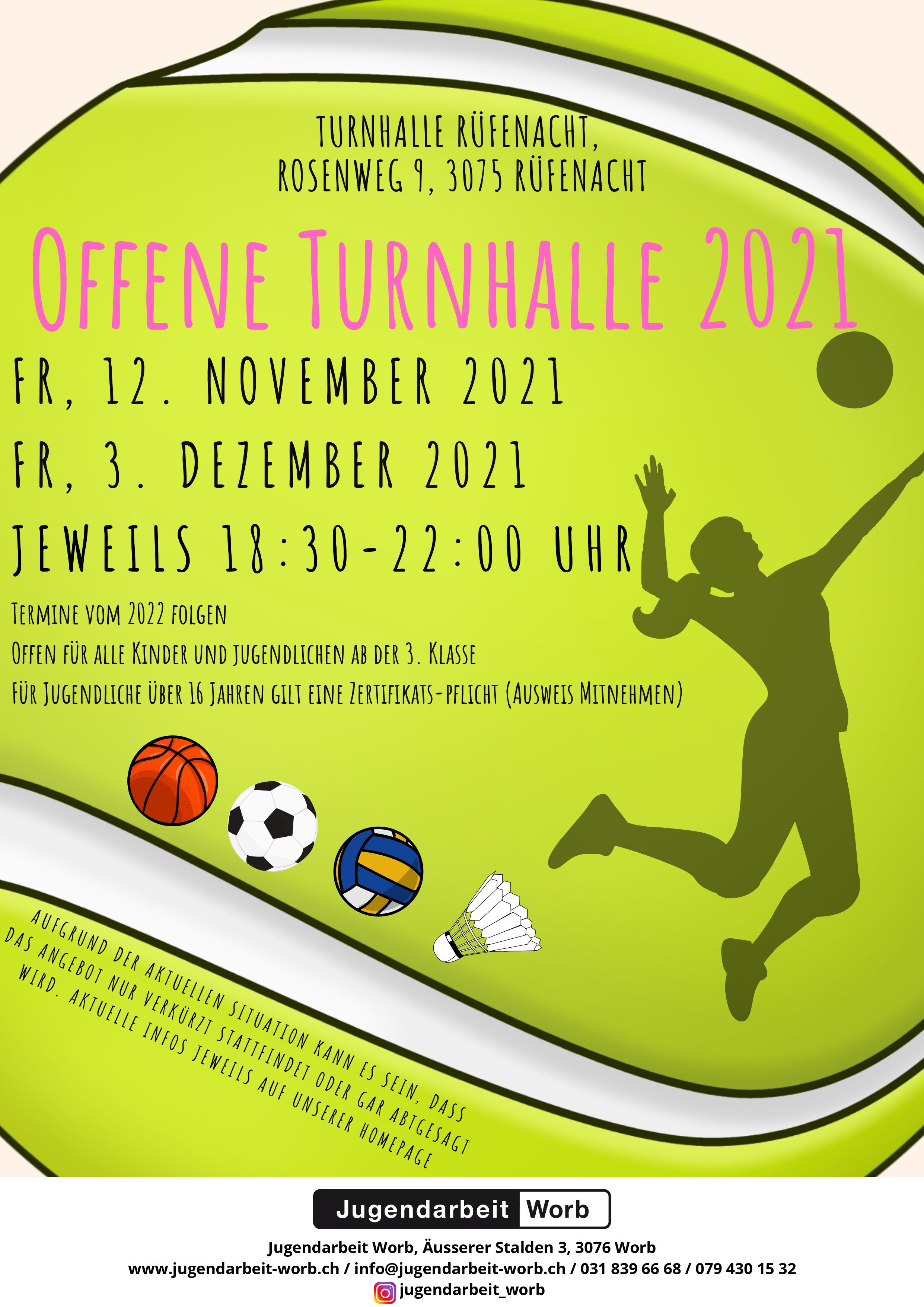 Einmal im Monat zwischen Oktober 2019 und März 2020 jeweils an einem Freitag findet die offene Turnhalle in Rüfenacht statt. Von 18:30 - 22 Uhr für alle Kinder und Jugendliche ab der 3. Klasse. Die genauen Daten findest du auf dem Flyer.